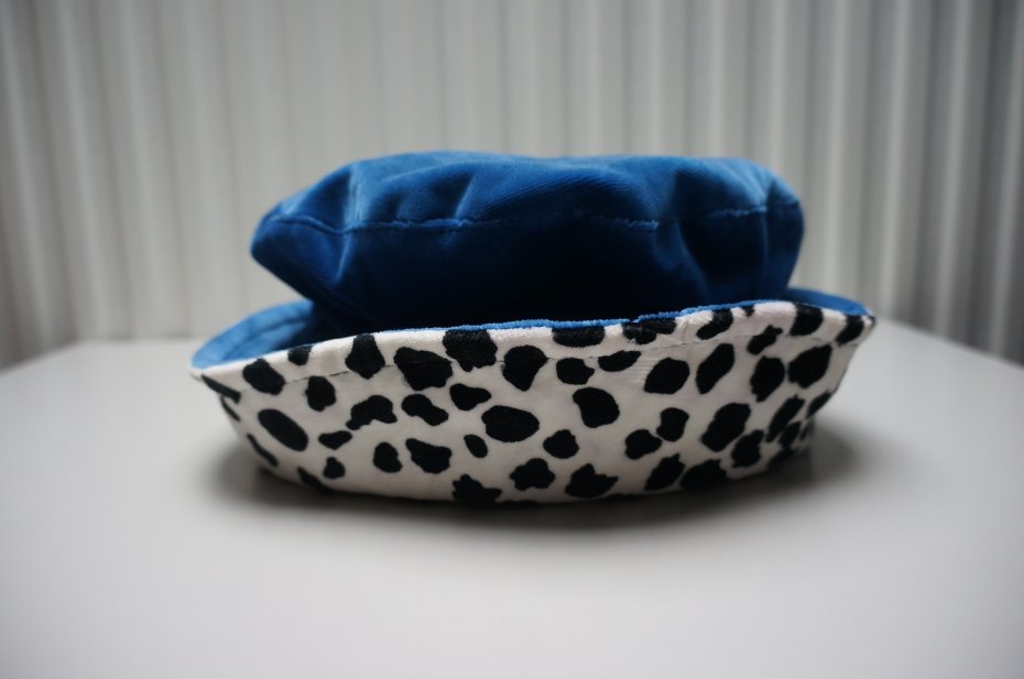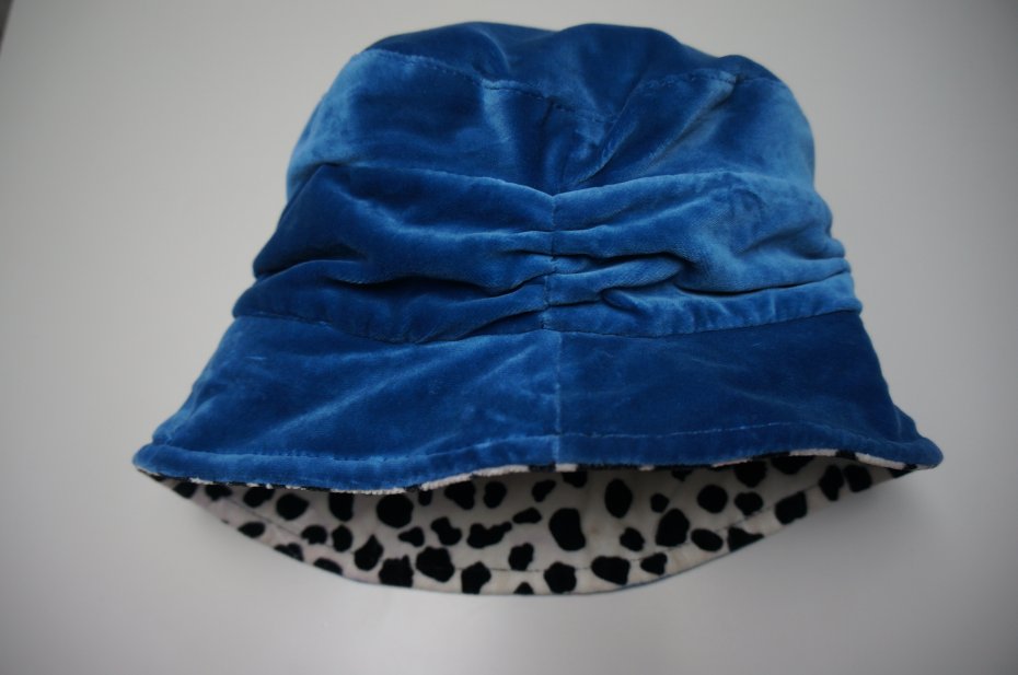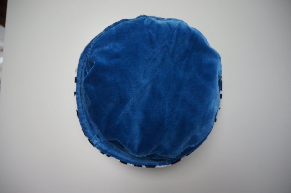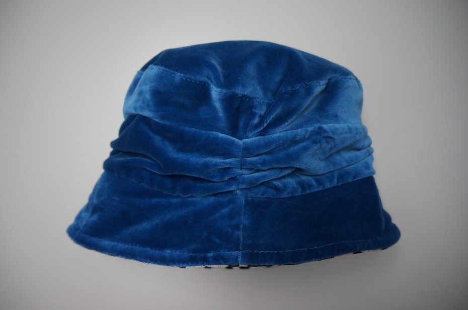 Elegancki kapelusz dla dziewczynki. Cały na podszewce. Materiał to welur lub aksamit. Kolor niebieski/morski.