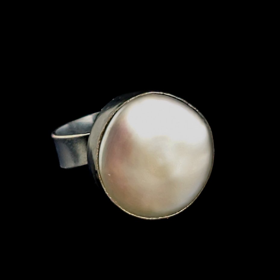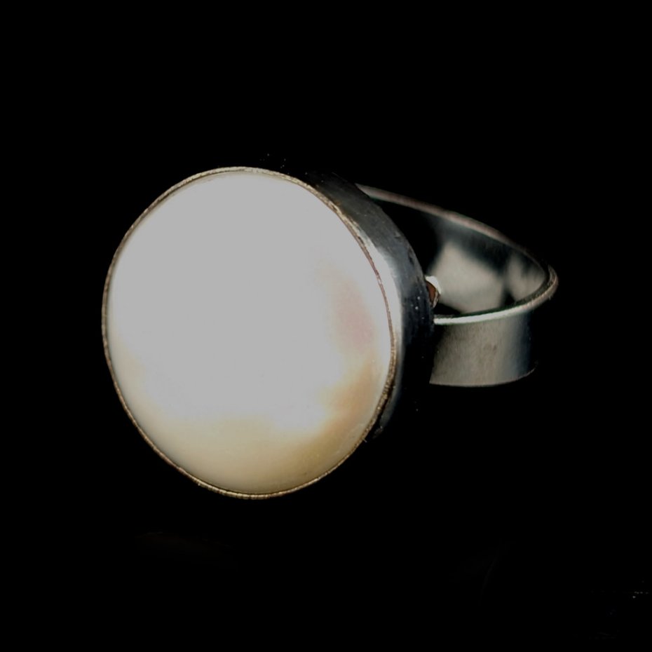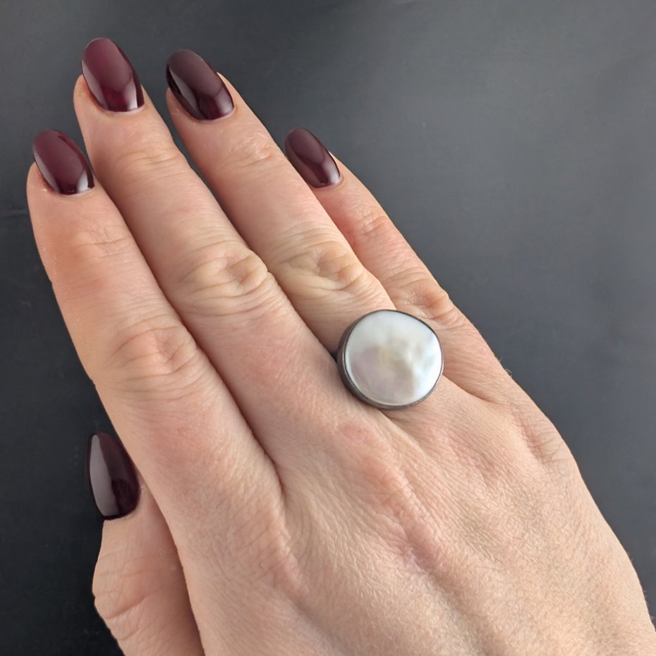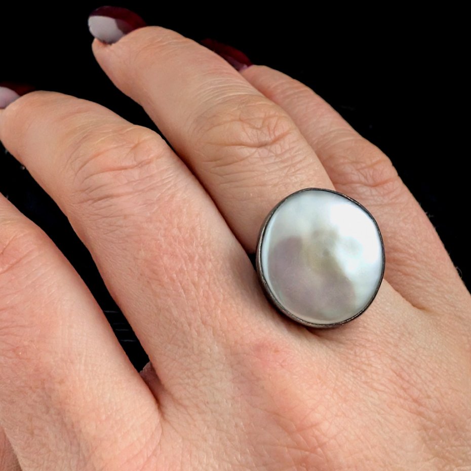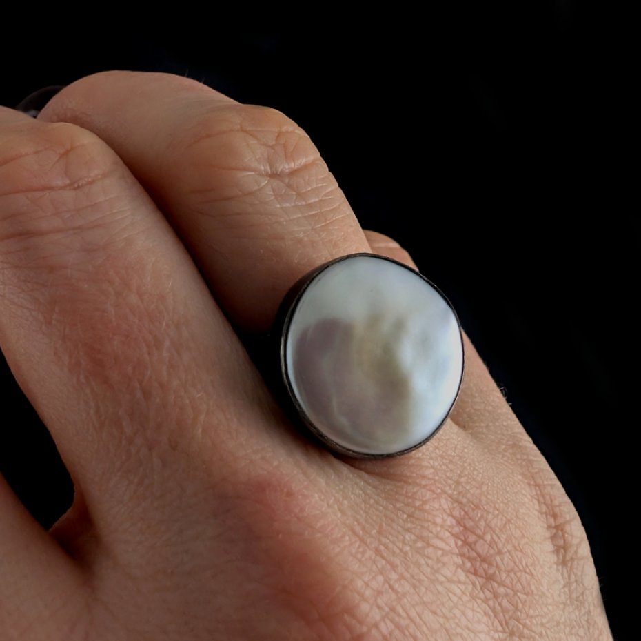Pierścień wykonany z oksydowanego srebra próby 925 z oprawioną okazałą, piękną perłą słodkowodną. Ponadczasowa elegancja, klasyka z nutą awangardy. Wymiary : średnica 18 mm, waga pierścienia 7,2 g. Rozmiar jubilerski regulowany w szerokim zaresie 12-28 Szerokość obrączki to 5 mm.