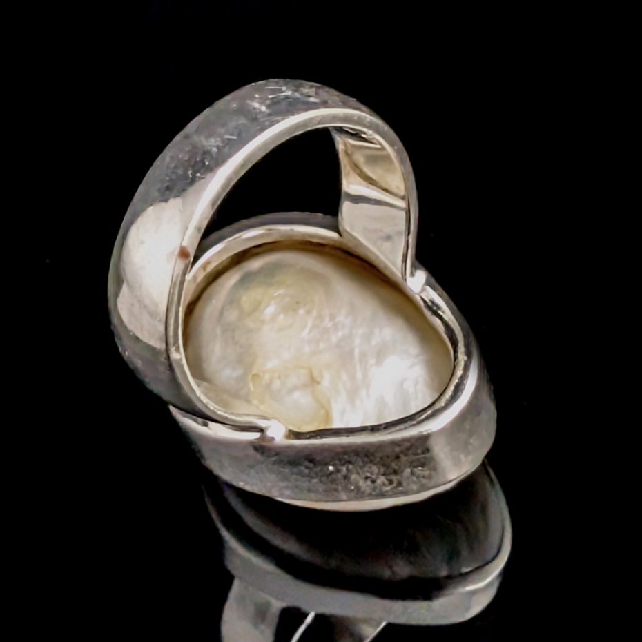 Pierścień wykonany ze srebra próby 925 z oprawioną okazałą, piękną naturalną perłą. Ponadczasowa elegancja, klasyka z nutą awangardy. Wymiary 23 x 16 mm, waga pierścienia 10,2 g. Rozmiar jubilerski 13, mogę powiększyć na max 14. Szerokość obrączki to 6 mm. Wykonany przez dostawcę kamieni.