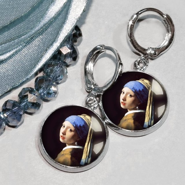Delikatne kolczyki wiszące z artystyczną grafiką, zatopioną pod wypukłym szkiełkiem, w oprawie w kolorze srebrnym.