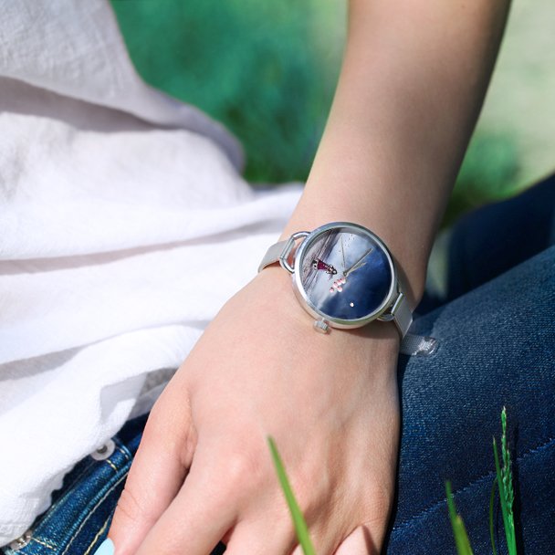Niepowtarzalny, autorski zegarek z limitowanej kolekcji Kraina Śniegu. Wielkość tarczy zegarka 36 mm, szerokość paseczka 8 mm. Paseczek to delikatna metalowa bransoletka z klasycznym zapięciem (na małą sprzączkę).