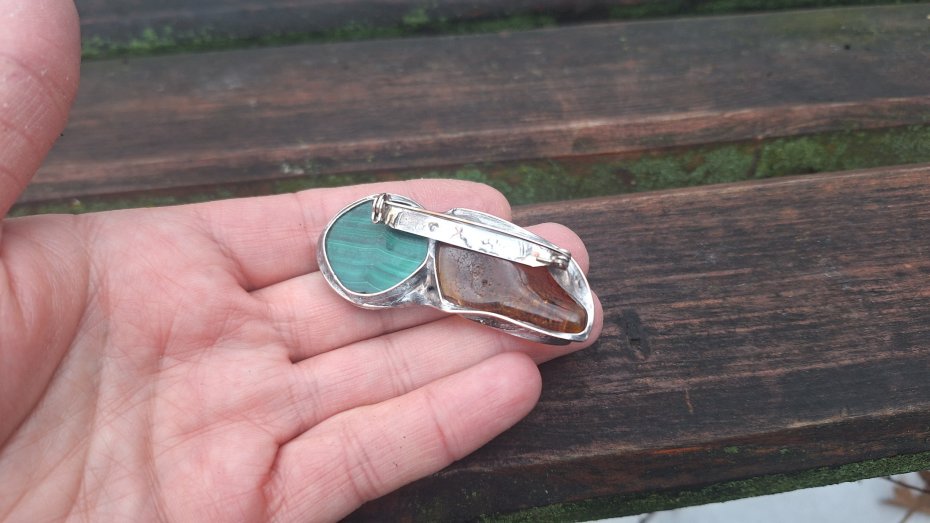Broszka wykonana z miedzi, cyny, bursztynu i malachitu. Wymiary ok. 5.5 na 2 cm. Zapięcie metalowe.