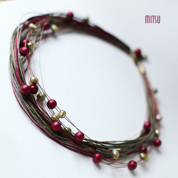 Dzika Poziomka - naszyjnik w gamie pięknej nasyconej stonowanej czerwieni oraz zieleni w odcieniach khaki. Zbudowany z perły hodowlanej, szklanej perły o matowym wykończeniu, sznurków woskowanych, rzemieni skórzanych, linek stalowych. Naszyjnik podróżuje ładnie zapakowany. Do kompletu można zamówić bransoletę widoczną na ostatnim zdjęciu - dostępna osobno.