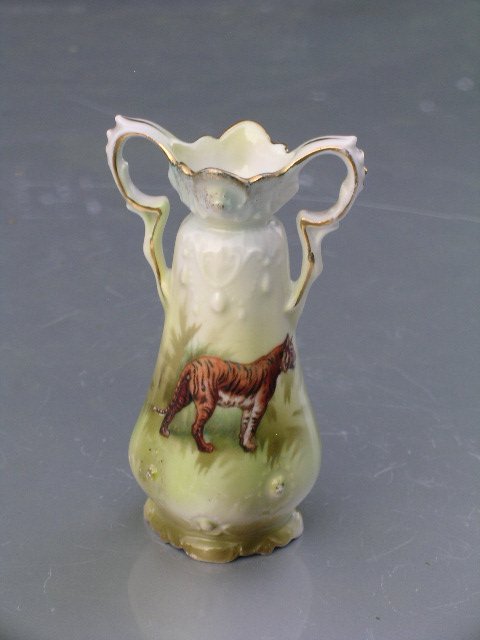 Stareńki wazonik, na bogato ryflowaniem zdobiony, w ciekawym, dawnej daty kształcie. Na satynowo-błyszcząco szkliwiony. Nie sygnowany. Przyjemnie leciutki. Dół 4,5; pękatość 5,5; wysokość 11,5 cm. Stan zachowania bardzo dobry minus gdzieniegdzie przetarcia złoceń.