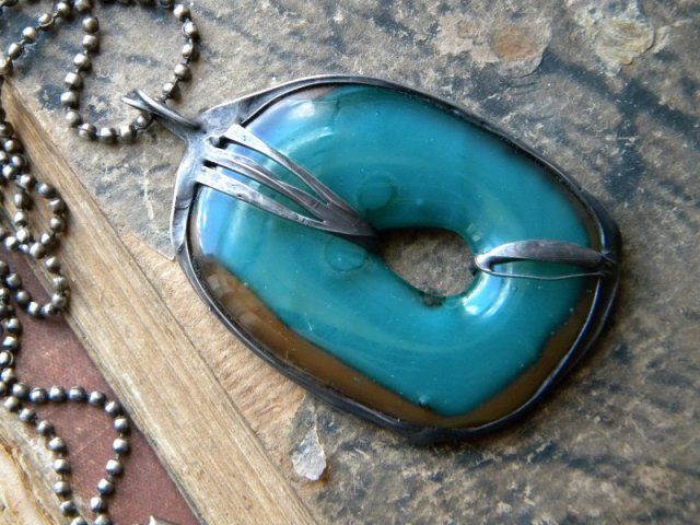 naszyjnik. zawieszka ze szkła i miedzi. stylizowana na stare srebro. wymiary 7,5cm x 4,6cm.łańcuszek z oksydowanej stali - 50cm.