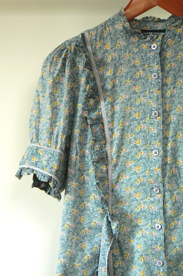 Kołnierzyk na stójce z falbanką, lekko bufiaste rękawy.