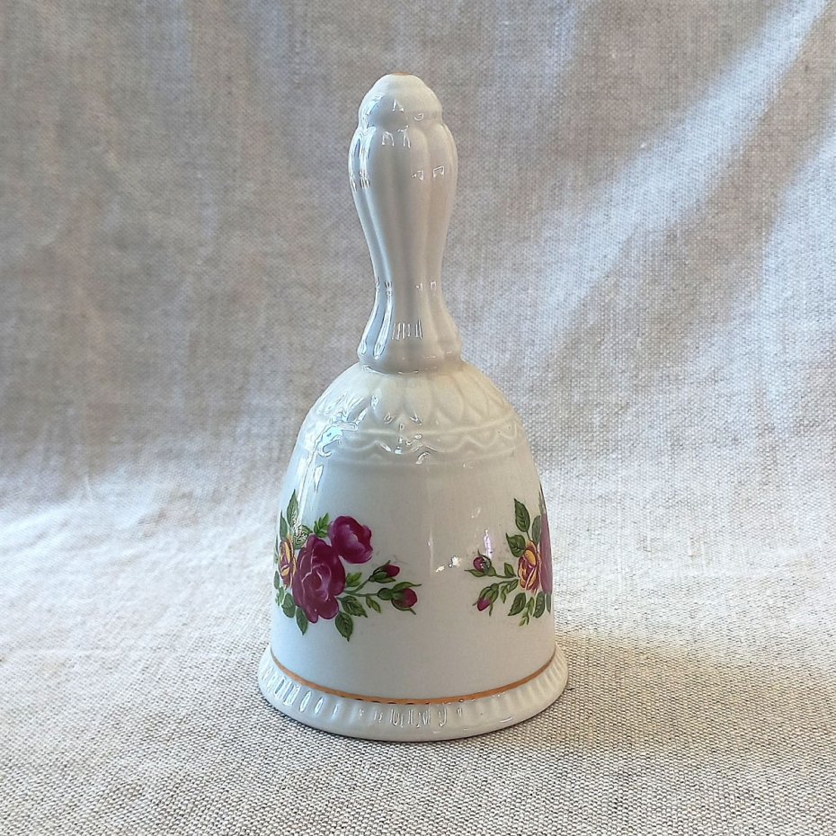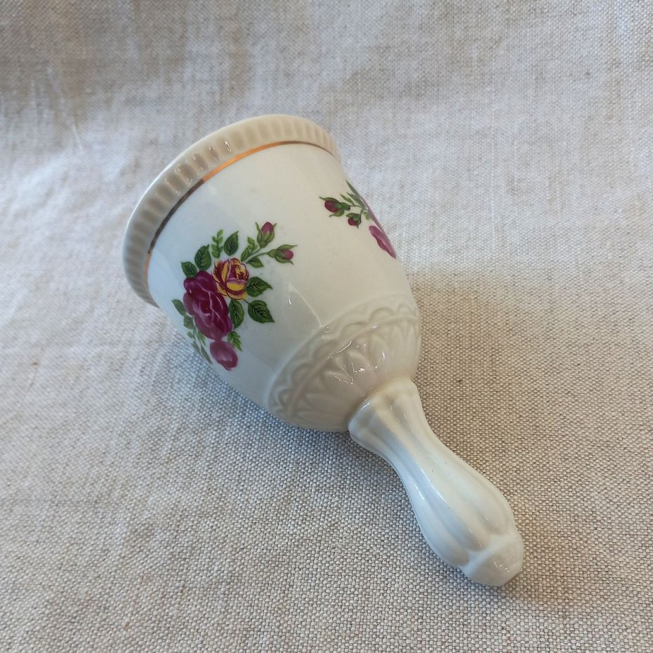 Dzwonek porcelanowy z sygnaturą 1877 GDR - wyprodukowany w fabryce Lipelsdorf w latach 1951 - 1974. Złocony, ozdobiony motywem róż.