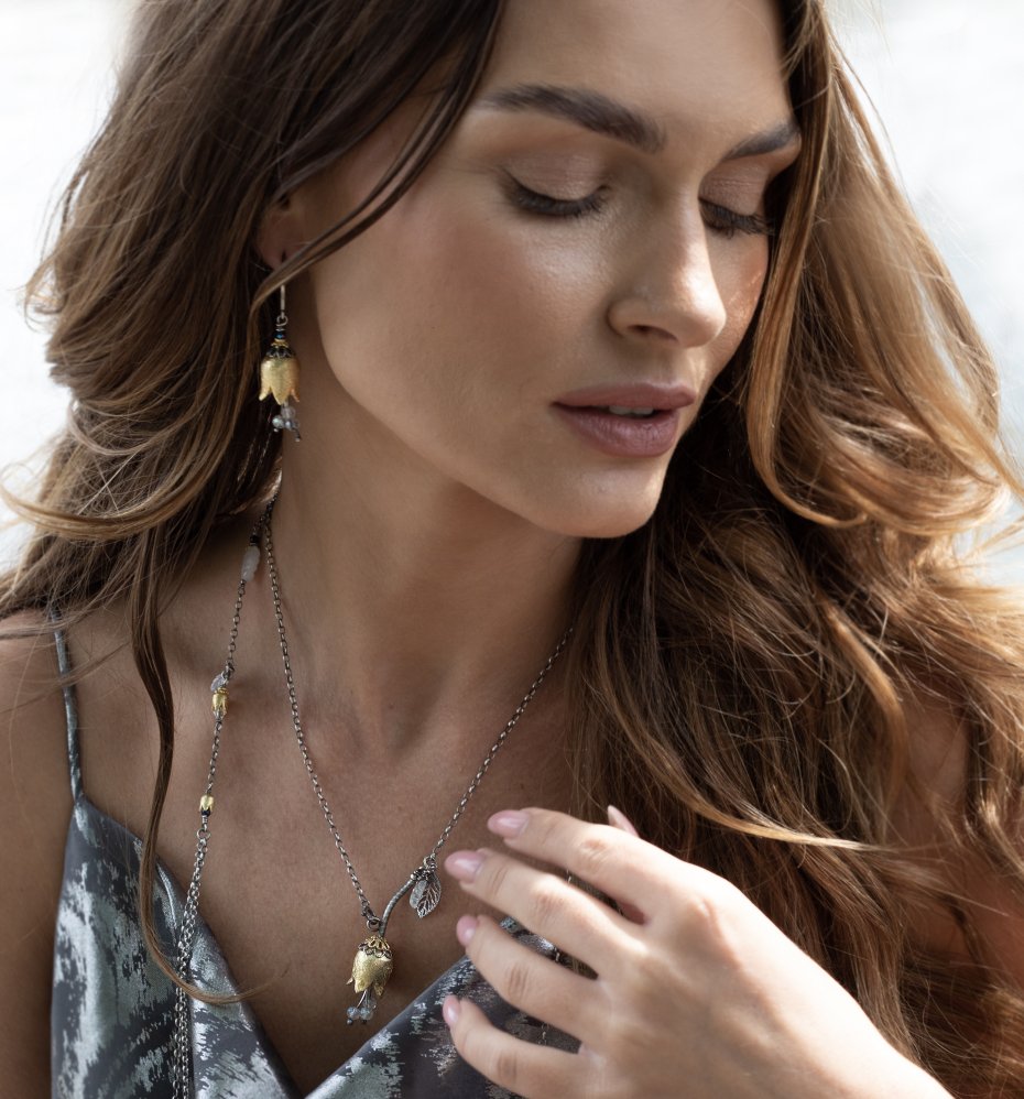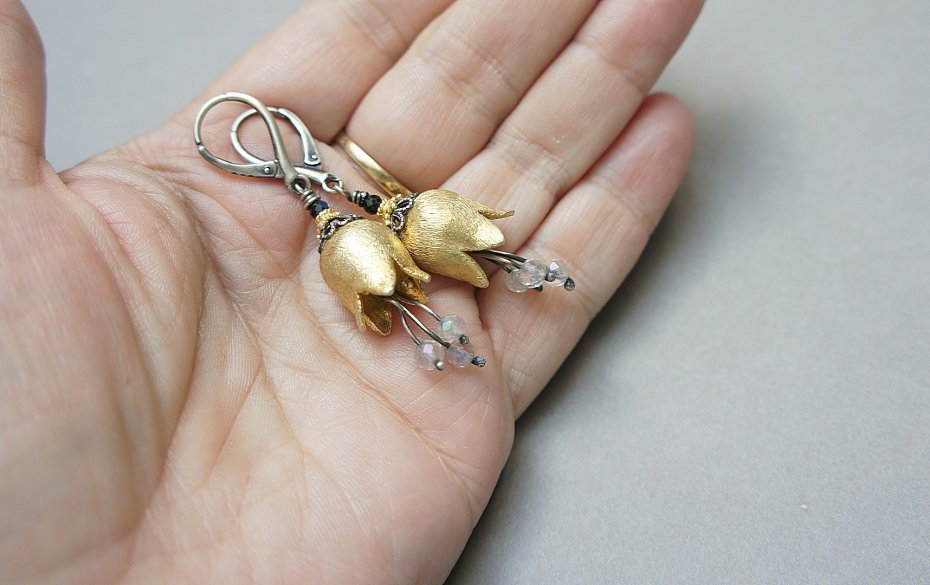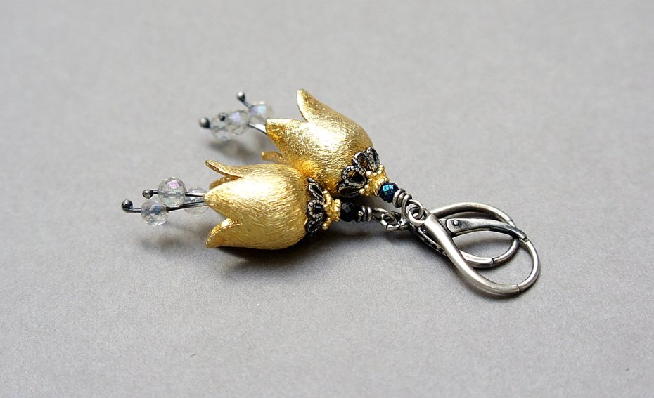Kolczyki wykonane ze srebra i srebra pokrytego 24 k złotem [pr.925] połączeniu z ręcznie formowanymi kielichami kwiatów [16mm] oraz fasetowanymi topazami mystic [4mm] i spinelami mystic [2mm]. Srebro częściowo oksydowane i przetarte. Całkowita długość kolczyków 6cm. Biżuteria ozdobnie zapakowana.
