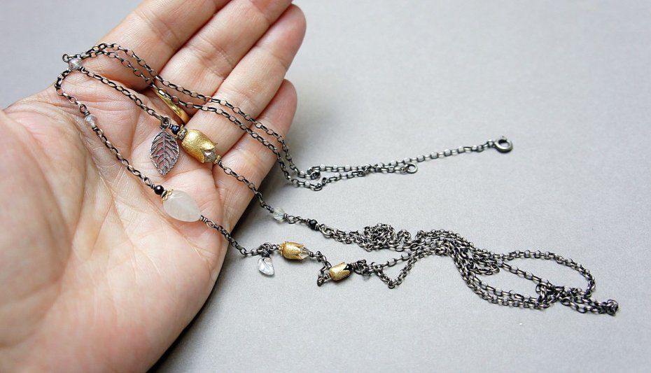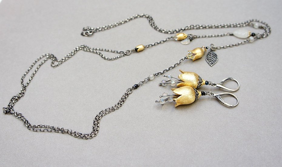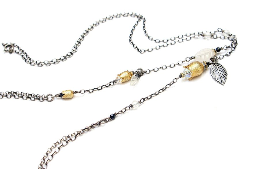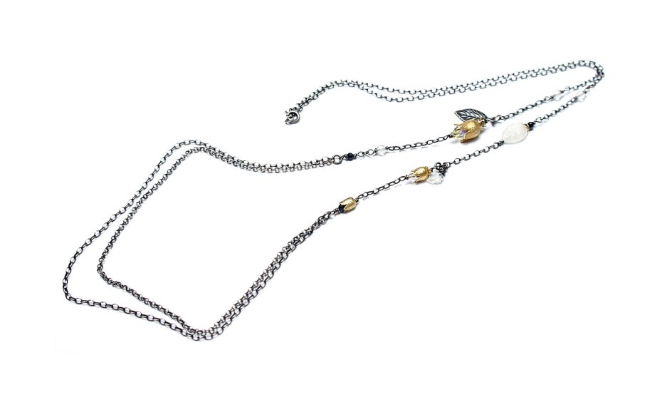 Długi naszyjnik dwurzędowy wykonany ze srebra i srebra pokrytego 24k zlotem [pr. 925] w połączeniu z ręcznie formowanymi kielichami kwiatów [10mm 8mm i 6mm], kuleczkami fasetowanych topazów mystic [4mm],fasetowanymi spinelami mystic [2mm], listkiem agatu [11mm], kryształkami Swarovskiego [6mm i 4mm] oraz rzeźbionym listkiem kamienia księżycowego. Srebro częściowo oksydowane i przetarte. Całkowita długość łańcuszka 90cm. Biżuteria ozdobnie zapakowana. Naszyjnik skomponowany tak ,by mógł stanowić komplet z drugim naszyjnikiem widocznym na zdjęciach .
