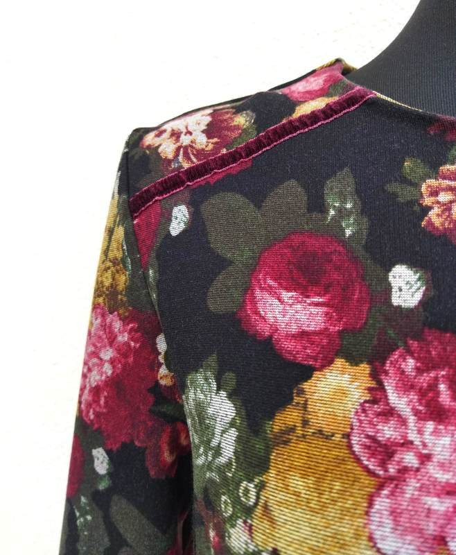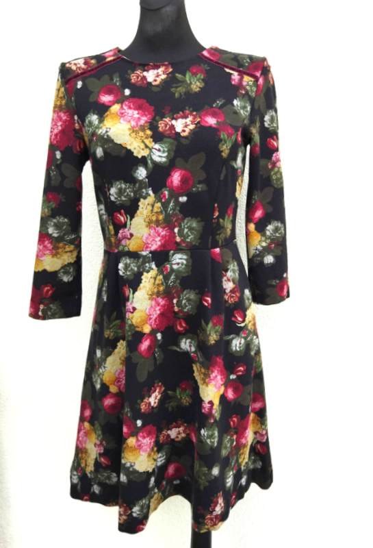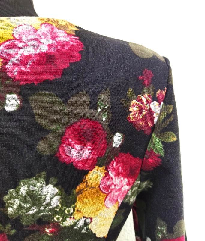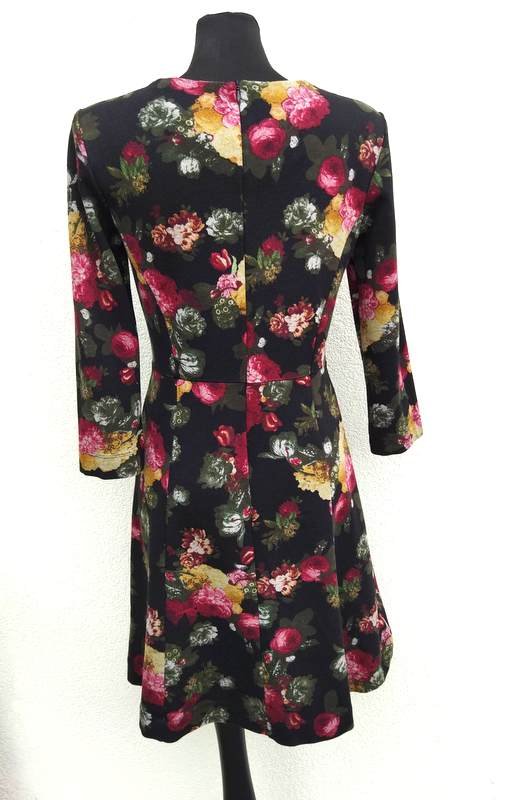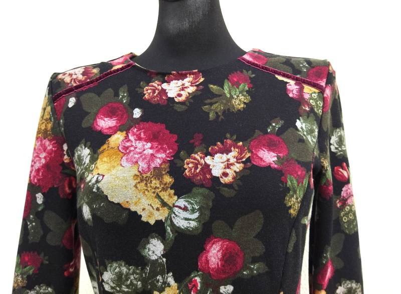 Sukienka z rozciągliwej masywnej tkaniny dzianinowej z kwiatowym wzorem w spokojnej kolorystyce na czarnym tle. Odcinana w pasie, góra dopasowana z karczkami z przodu obszytymi aksamitną tasiemką, dół trapezowy poszerzany z dwiema zakładkami po bokach. Zapinana z tyłu na długi zamek. bez podszewki