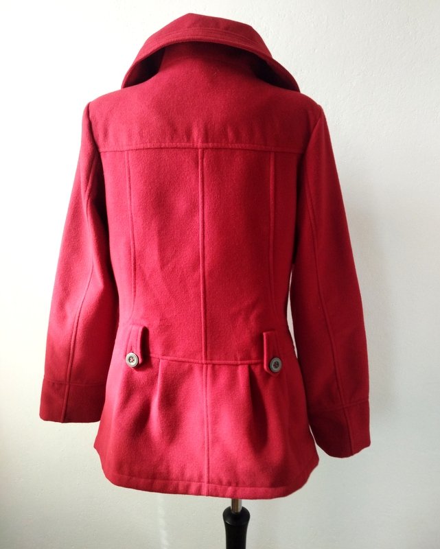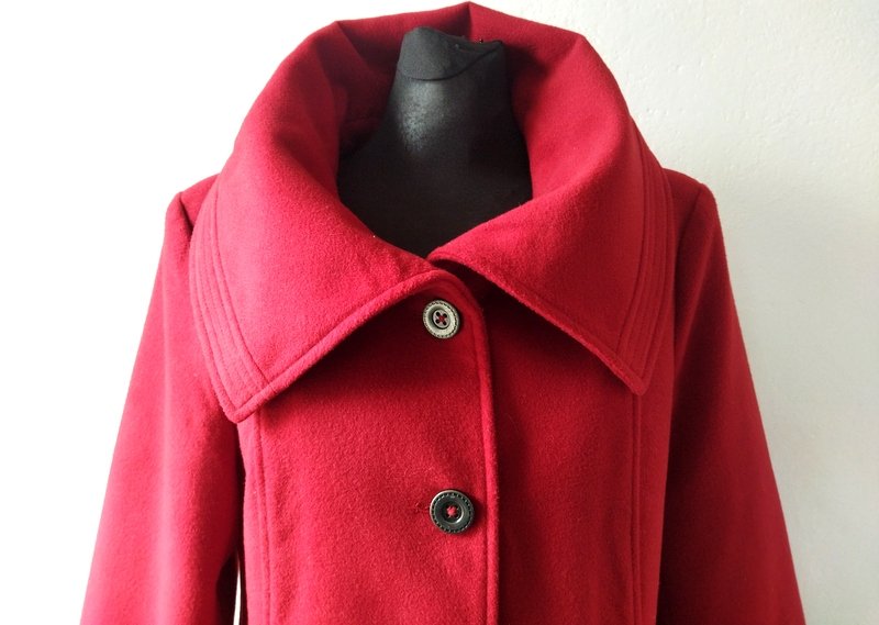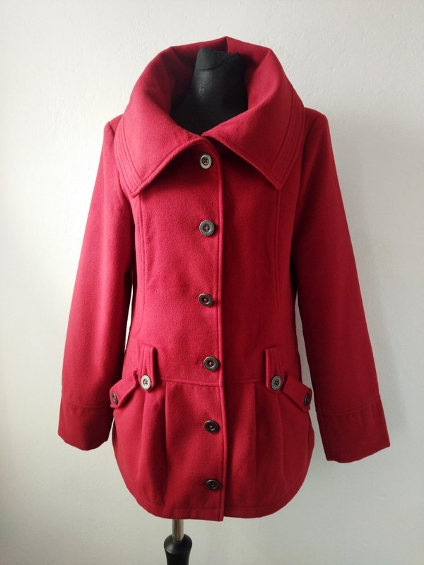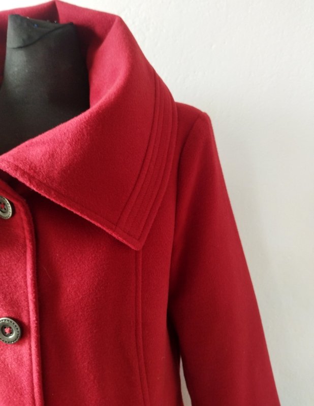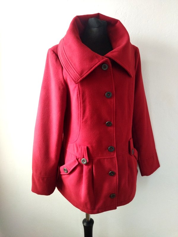 Ciekawa kurtka z flauszowej tkaniny poliestrowej w kolorze jarzębinowej czerwieni. Starannie uszyta z licznymi detalami. Z wykładanym kołnierzem , z dwiema wpuszczanymi kieszeniami . zapinana na ozdobne metalowe guziki. całość na podszewce w kolorze kurtki