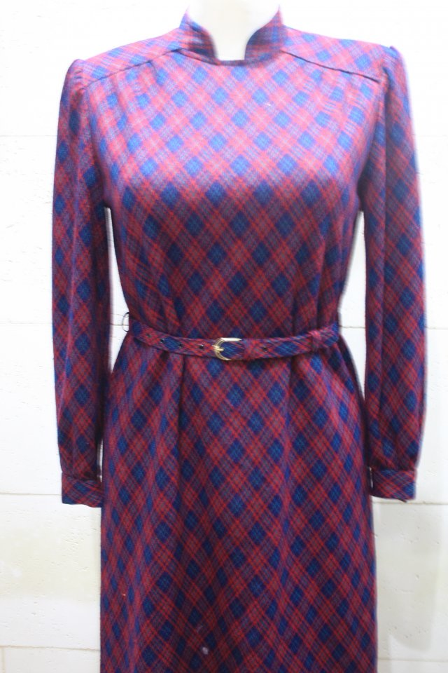 kraciasta sukienka vintage z lat 70/80-tych (kolor ciemniejszy niż na zdjęciach), stójka, na plecach zapięcie na suwak, rękawy zapinane na guzik, w ramionach poduszki, w komplecie pasek