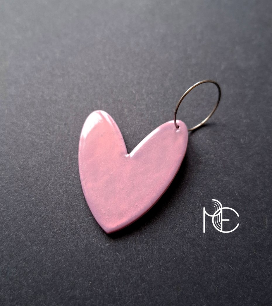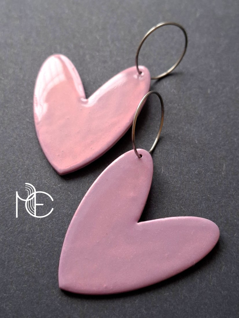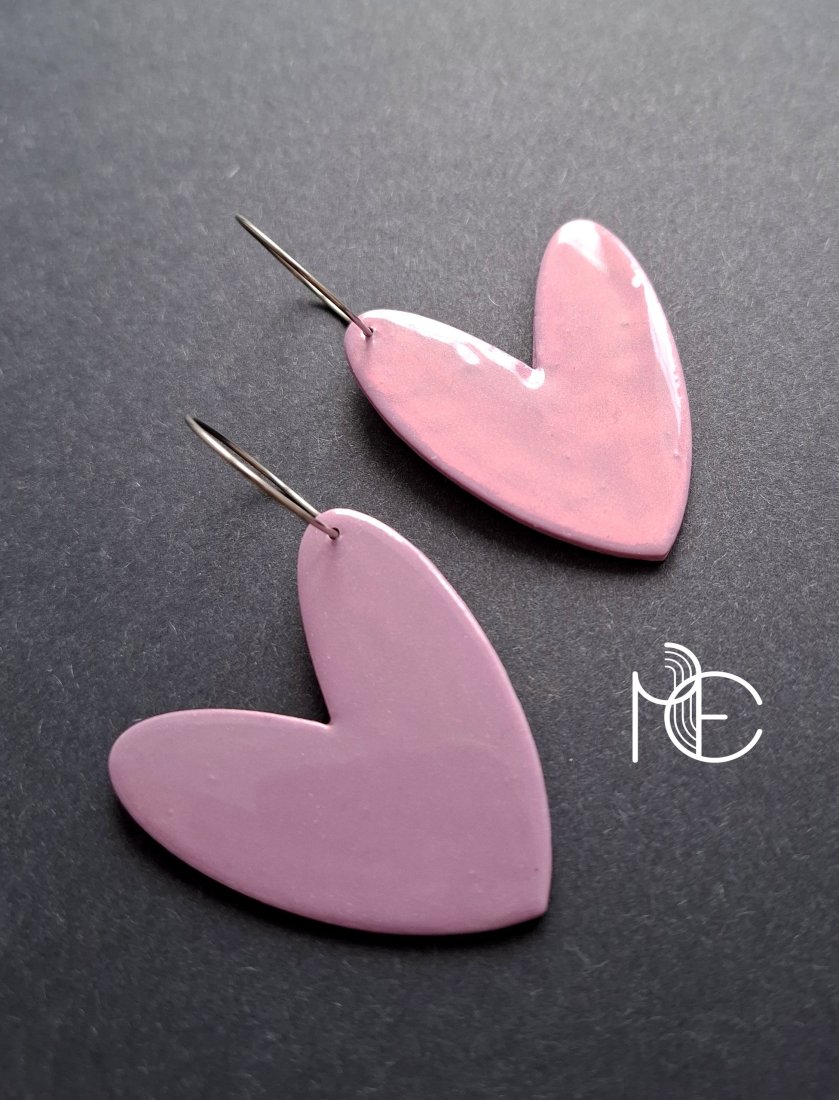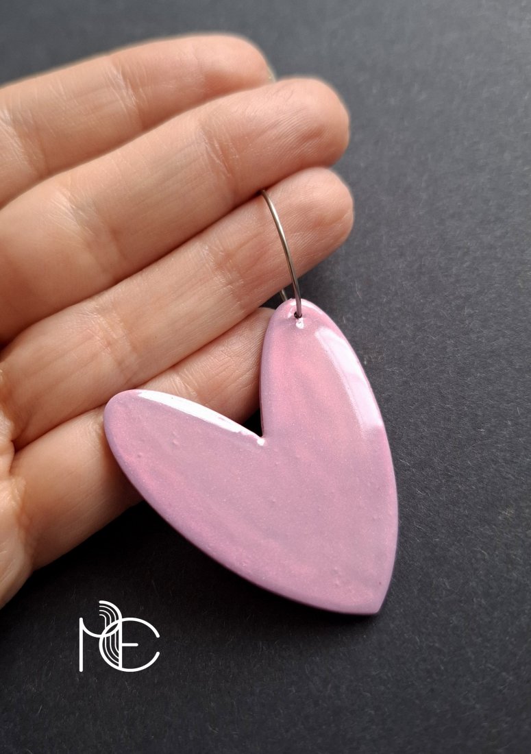 Lekkie, wiszące kolczyki wykonane z wysokiej jakości glinki polimerowej mieniące się w przy padaniu światła. Podwieszone na kolistych, posrebrzanych i nieuczulających biglach z prostym zapięciem. Wymiary: długość całkowita: 6,3 cm; szerokość max. 3,5 cm.