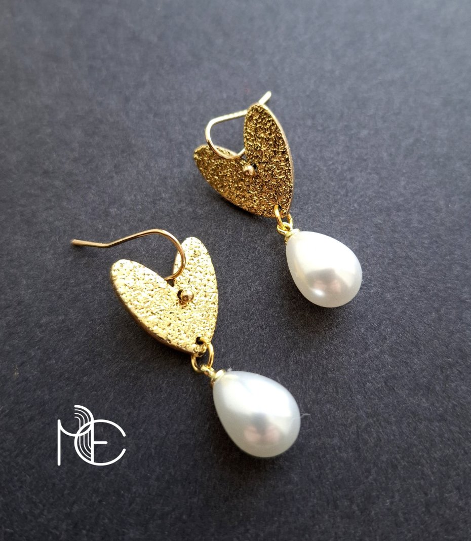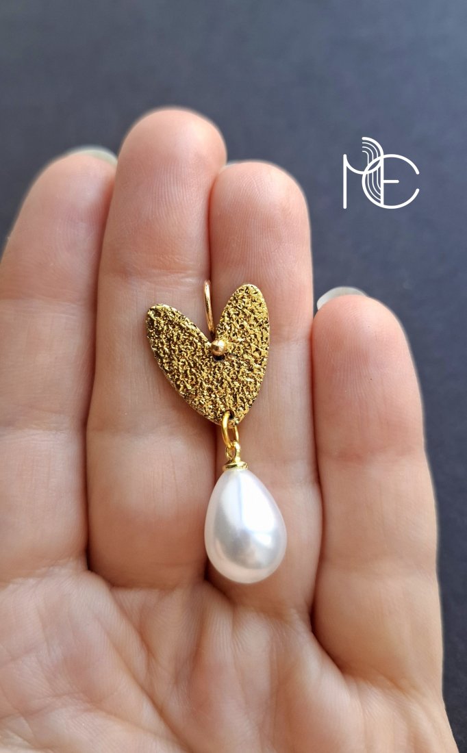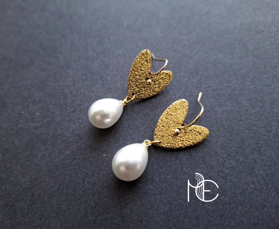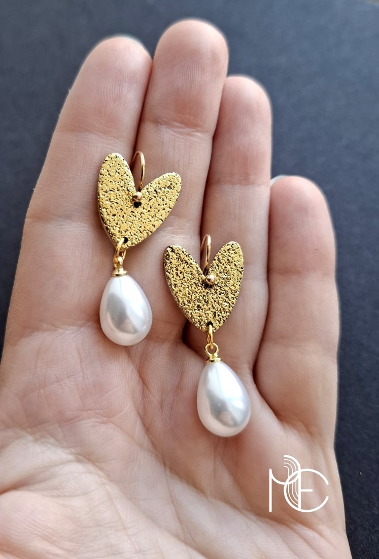Lekkie, wiszące kolczyki wykonane z wysokiej jakości glinki polimerowej z podwieszonymi szklanymi perełkami. Jednostronne, z prostymi, pozłacanymi i nieuczulającymi biglami. Wymiary: długość całkowita: 3,7 cm; szerokość max. 1,5 cm.