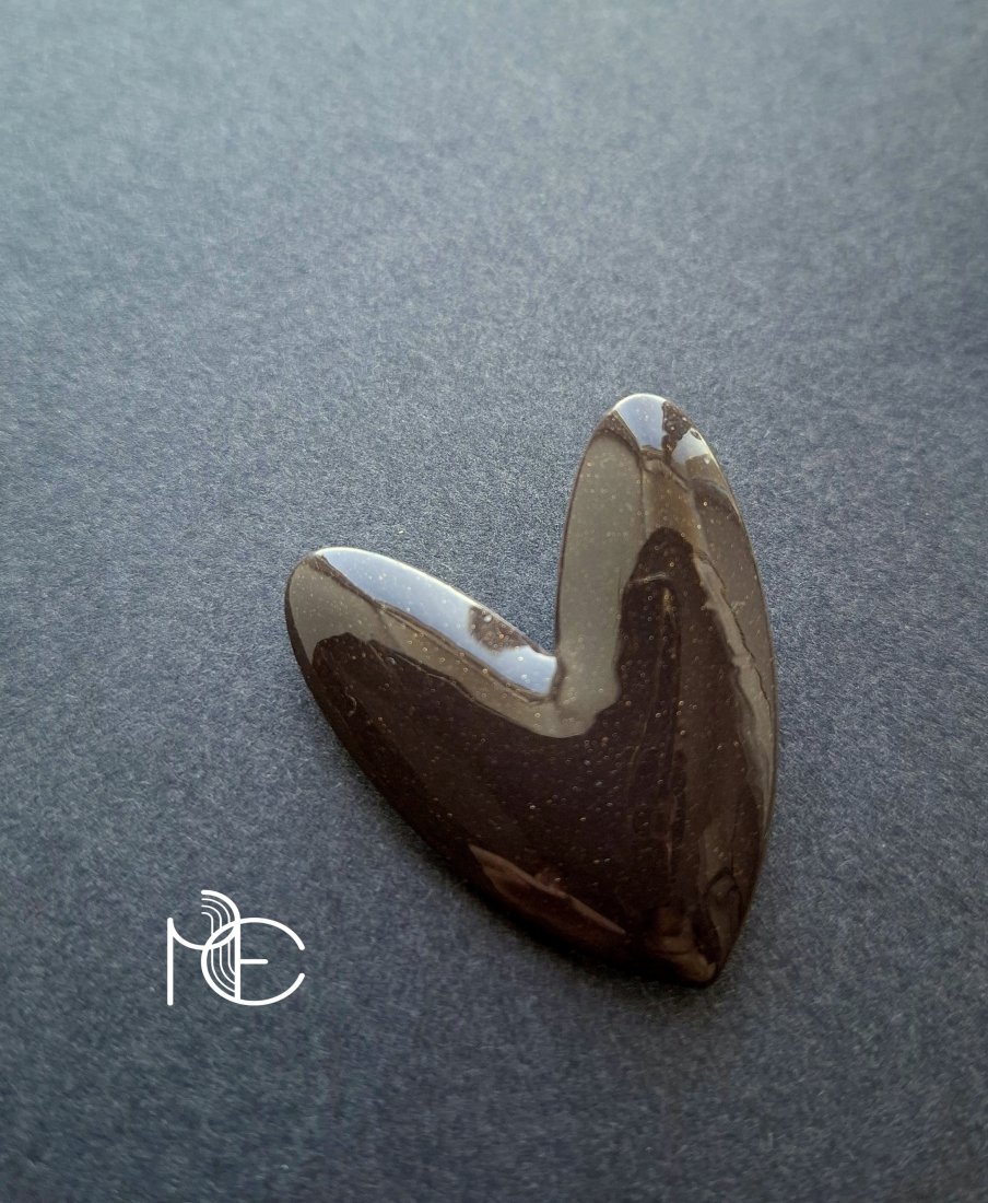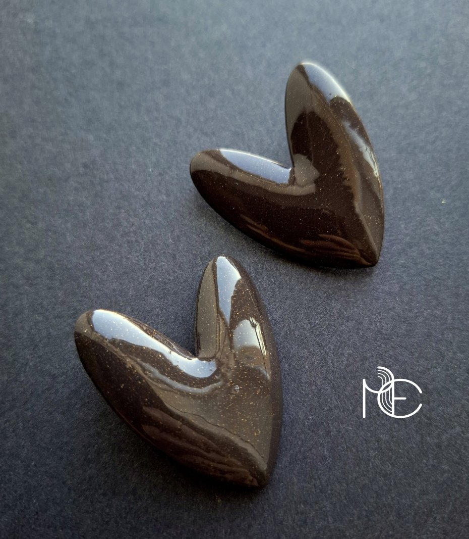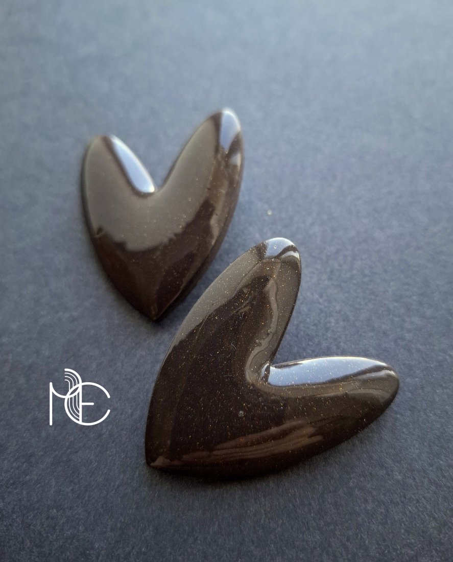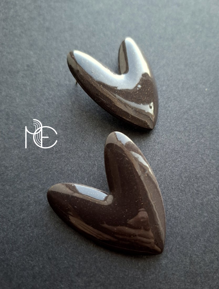 Efektowne, lekkie kolczyki na sztyfty wykonane z wysokiej jakości glinki polimerowej w odcieniu gorzkiej czekolady z drobinkami złota. Jednostronne z pozłacanymi, nieuczulającymi sztyftami. Wymiary: długość wraz z zapięciem: 4,5 cm; szerokość max. 3,8 cm. Wykonane w jedynym egzemplarzu.