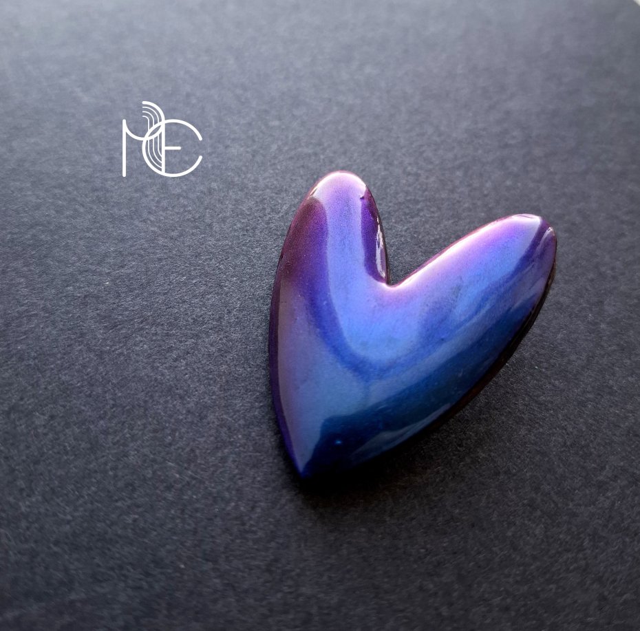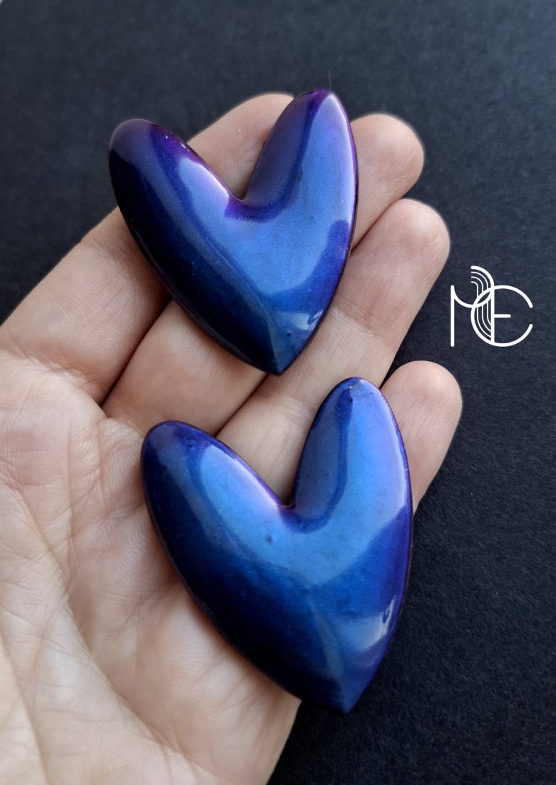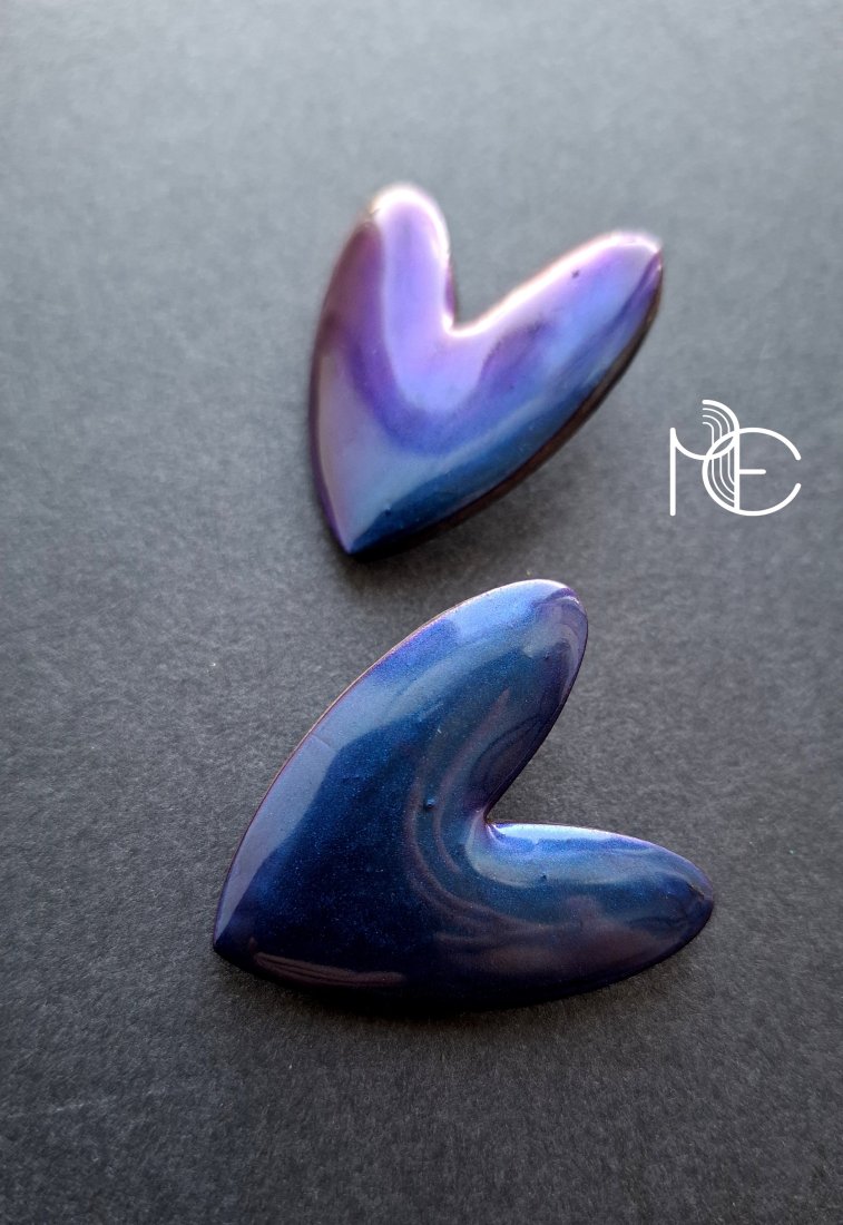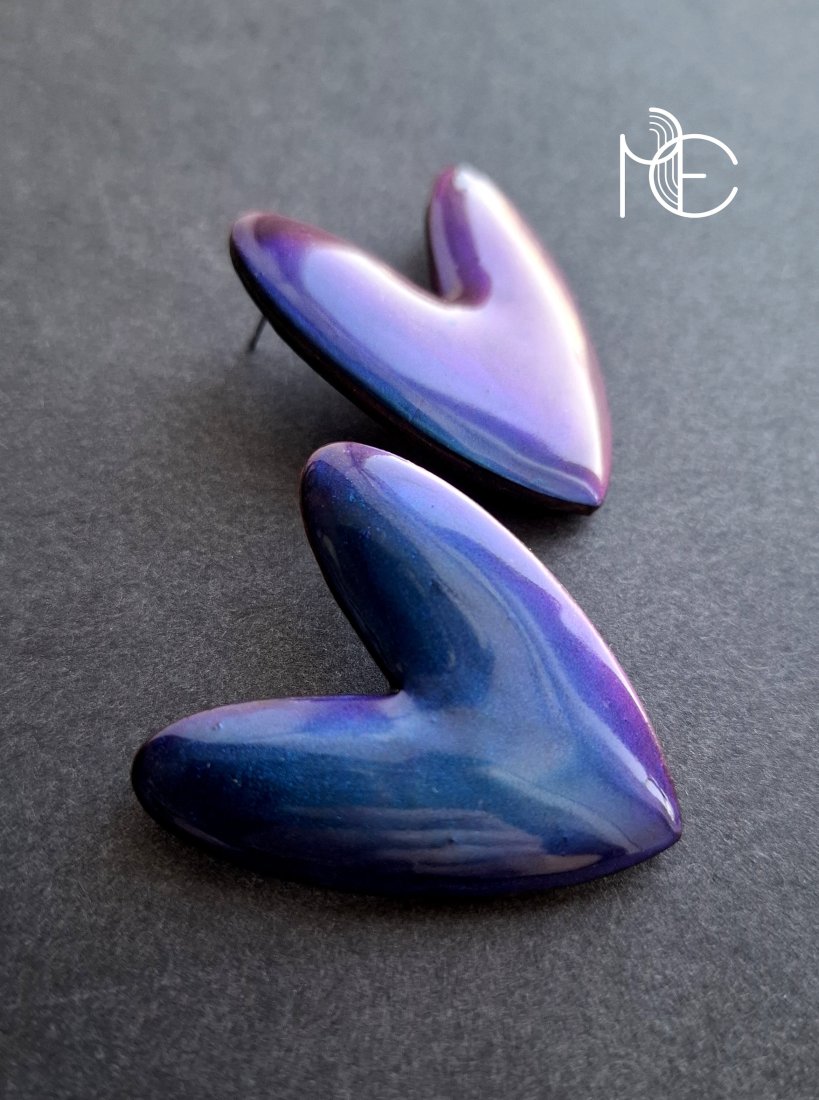 Efektowne, lekkie kolczyki na sztyfty wykonane z wysokiej jakości glinki polimerowej, mieniące się barwami przy padaniu światła. Jednostronne z posrebrzanymi, nieuczulającymi sztyftami. Wymiary: długość wraz z zapięciem: 4,5 cm; szerokość max. 3,8 cm. Wykonane w jedynym egzemplarzu.