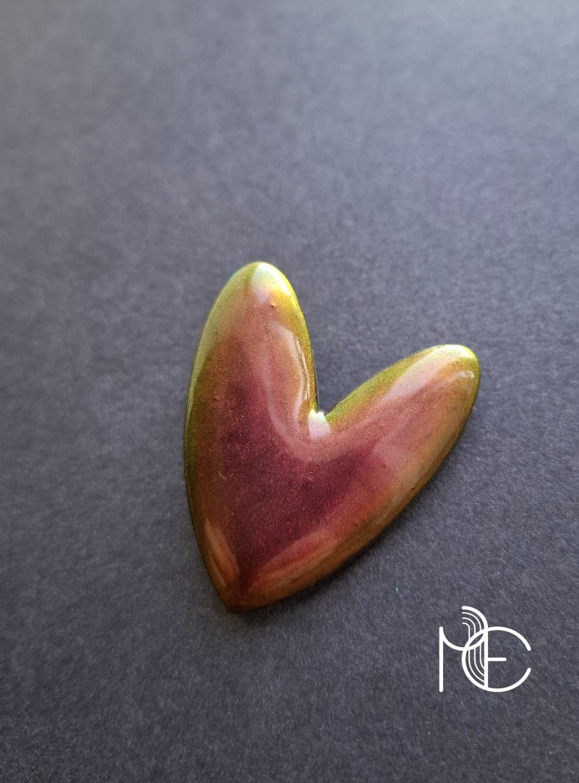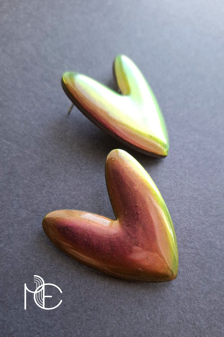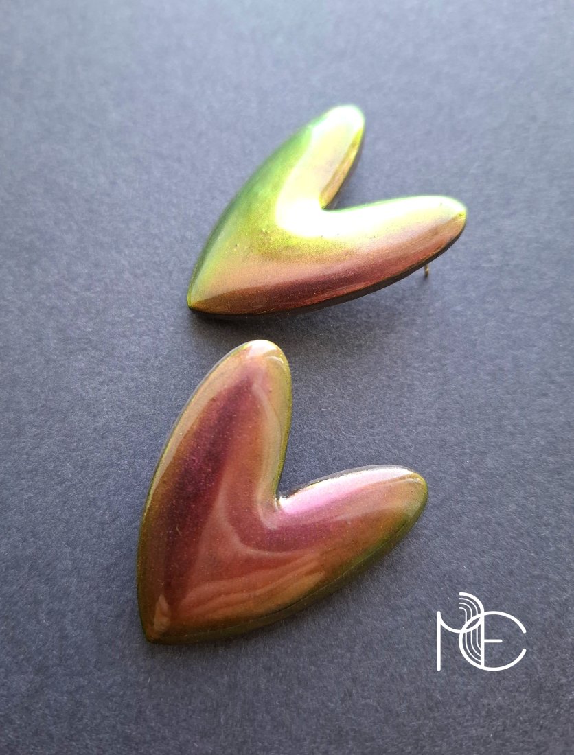 Efektowne, lekkie kolczyki na sztyfty wykonane z wysokiej jakości glinki polimerowej, mieniące się barwami przy padaniu światła. Jednostronne z posrebrzanymi, nieuczulającymi sztyftami. Wymiary: długość wraz z zapięciem: 4,5 cm; szerokość max. 3,8 cm. Wykonane w jedynym egzemplarzu.