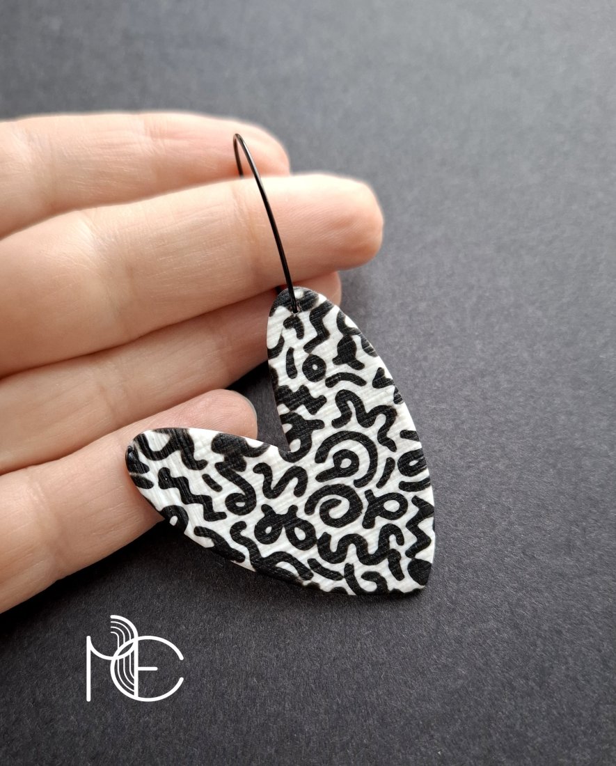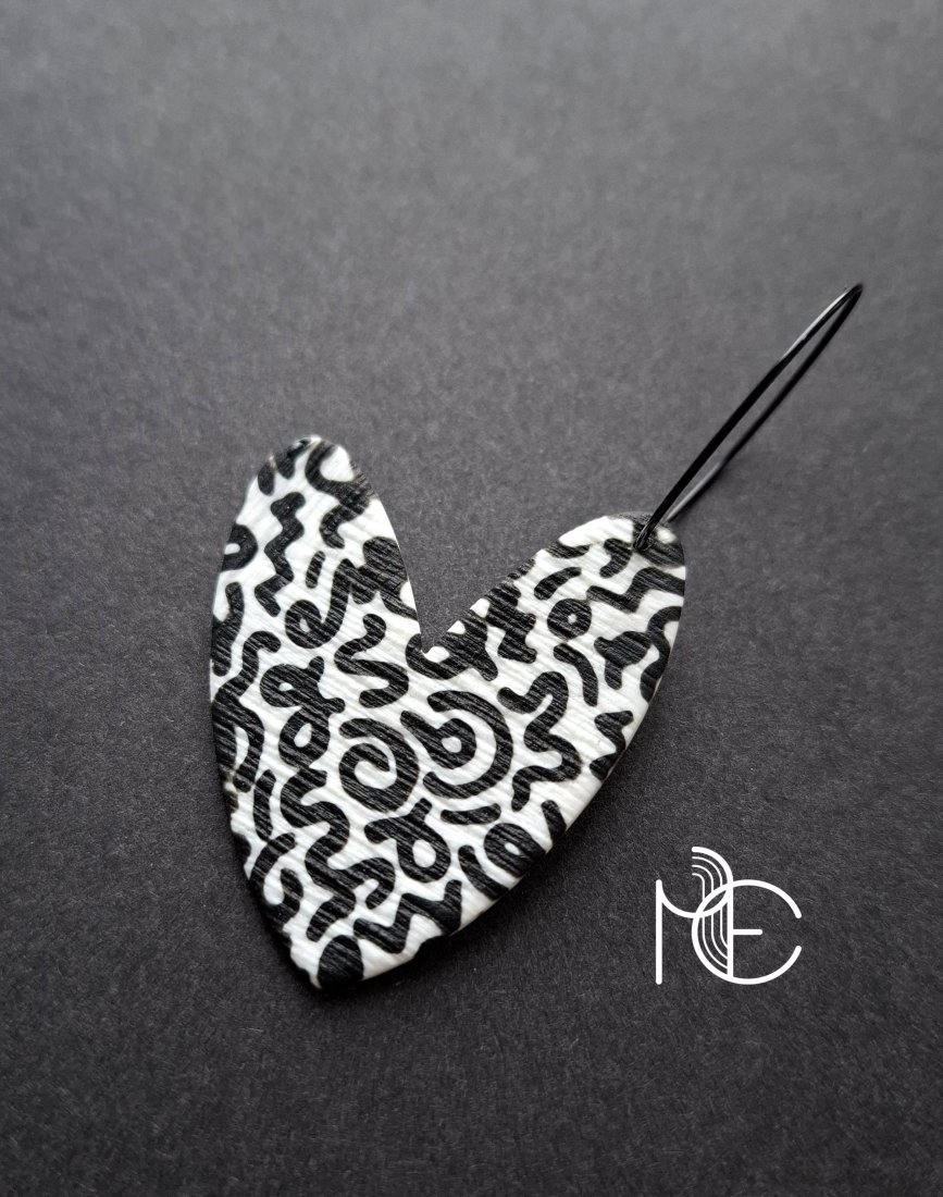 Lekkie, wiszące kolczyki wykonane z wysokiej jakości glinki polimerowej. Jednostronne, podwieszone na kolistych, nieuczulających biglach z prostym zapięciem. Wymiary: długość całkowita: 6,8 cm; szerokość max. 3,8 cm.