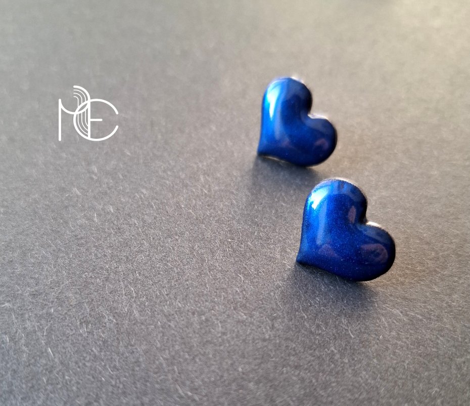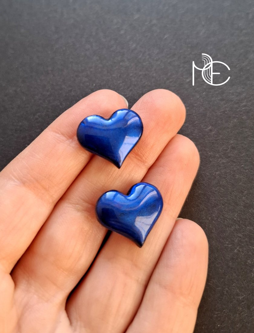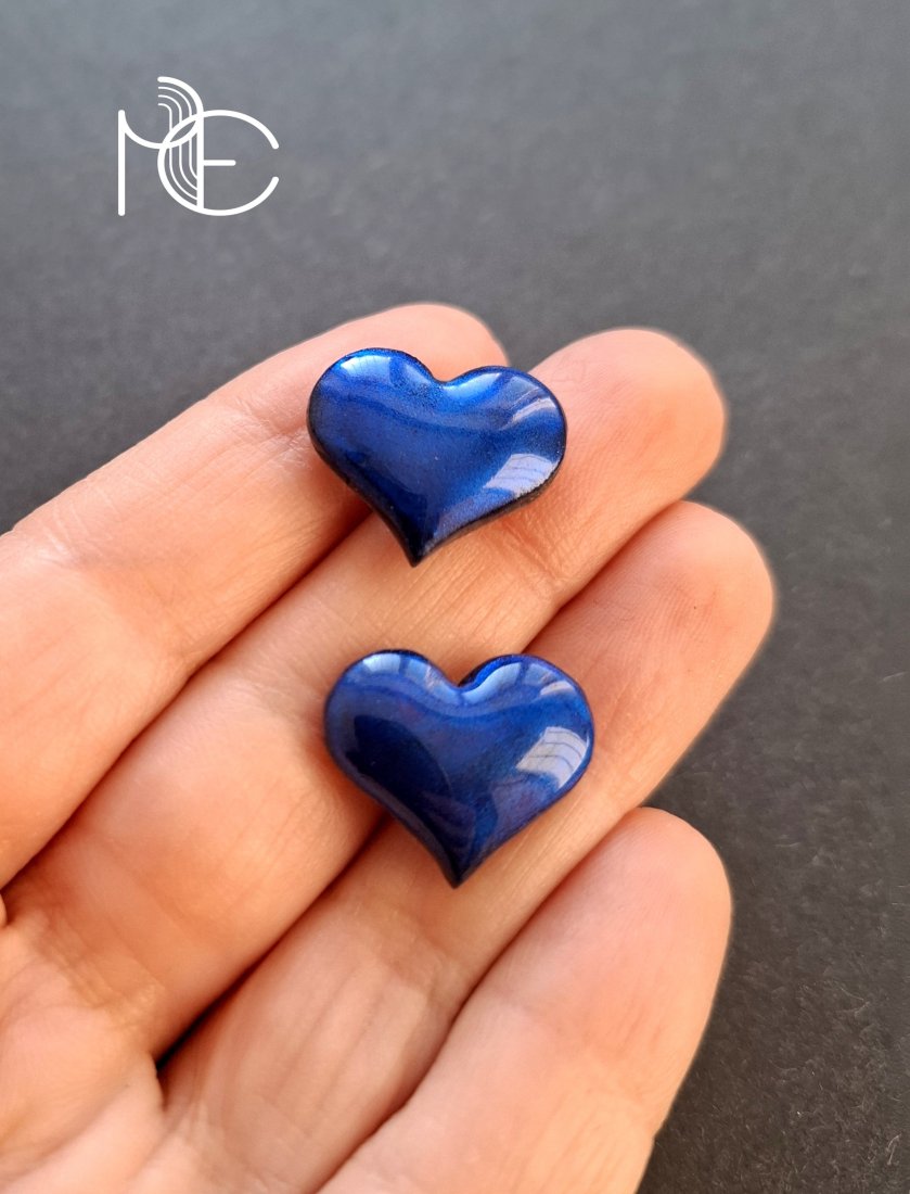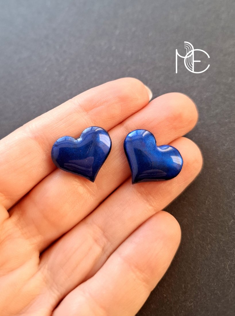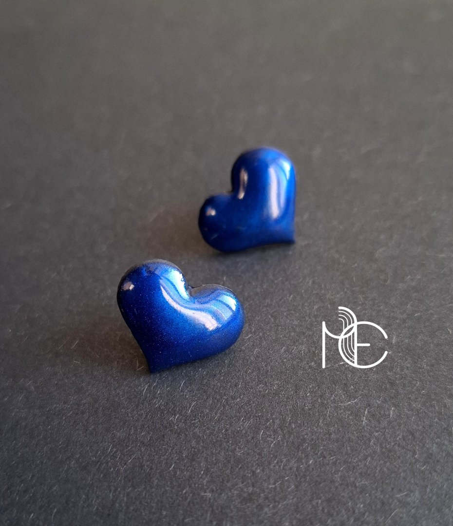 Kolczyki na sztyfty wykonane z wysokiej jakości glinki polimerowej. Jednostronne z posrebrzanymi, nieuczulającymi sztyftami. Wymiary: długość wraz z zapięciem: 1,6 cm; szerokość max. 1,8 cm.