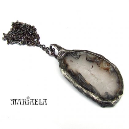 Serdecznie zapraszam do spojrzenia na wyjątkowy wisior wykonany z interesującej tafli szlifowanego agatu. Długość razem z oczkiem 7,1 cm. Trwałe wykończenie witrażowe, przy użyciu ekologicznej, bezołowiowej cyny. Długi, posrebrzany, oksydowany łańcuszek. Prawdziwy rarytas :-) Pojedynczy projekt! Zapraszam!