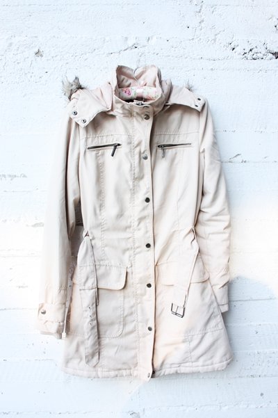 ocieplany płaszczyk -kurtka w kolorze ecru, rozmiar M. Reserved,szer.w ramionach40cm,pod pachami 2x50cm.,pas 2x46cm.,biodra 2x52cm.,dl.plecow bez kaptura 80cm.,dl.ramienia 11cm.,dl.rekawa 63cm.