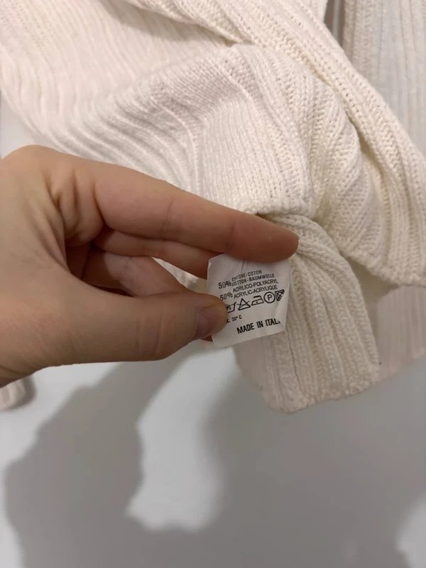 Miękki i przyjemny w dotyku sweter premium Le Tricot Longhin – Made in Italy. Model w kolorze ecru, wykonany z mieszanki 50% bawełny i 50% akrylu, świetnie oddycha, a jednocześnie trzyma ciepło. Ma elegancki prążkowany splot oraz klasyczny dekolt V, który wysmukla sylwetkę.