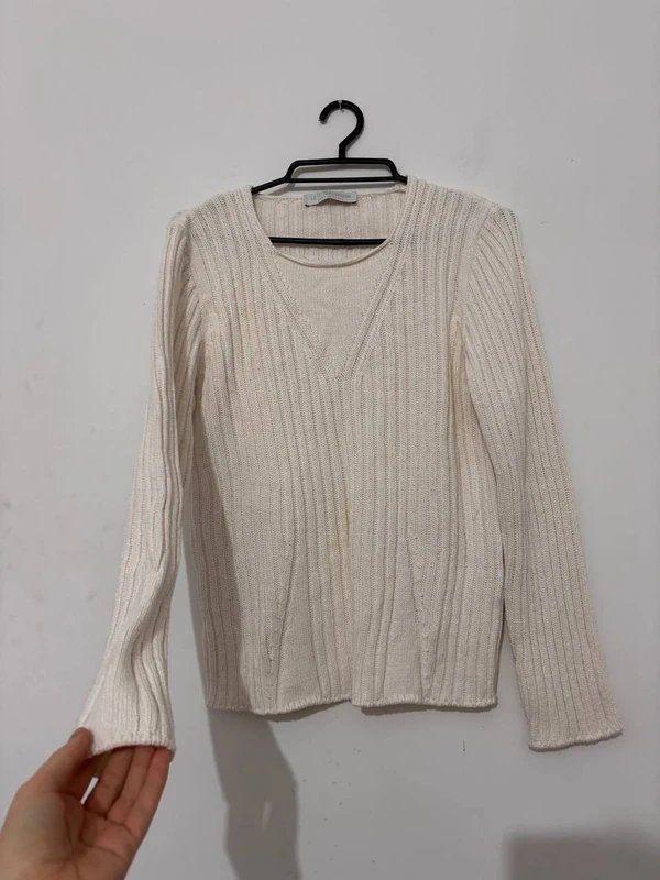 women sweater, ecru sweater, ribbed sweater, V neck sweater, italian sweater, premium knit, made in italy sweater, elegant sweater, classic knit, light sweater, cotton sweater, soft knit, everyday sweater, minimal sweater, long sleeve sweater, chic knit, warm knitwear, casual sweater, basic knit, ladies sweater