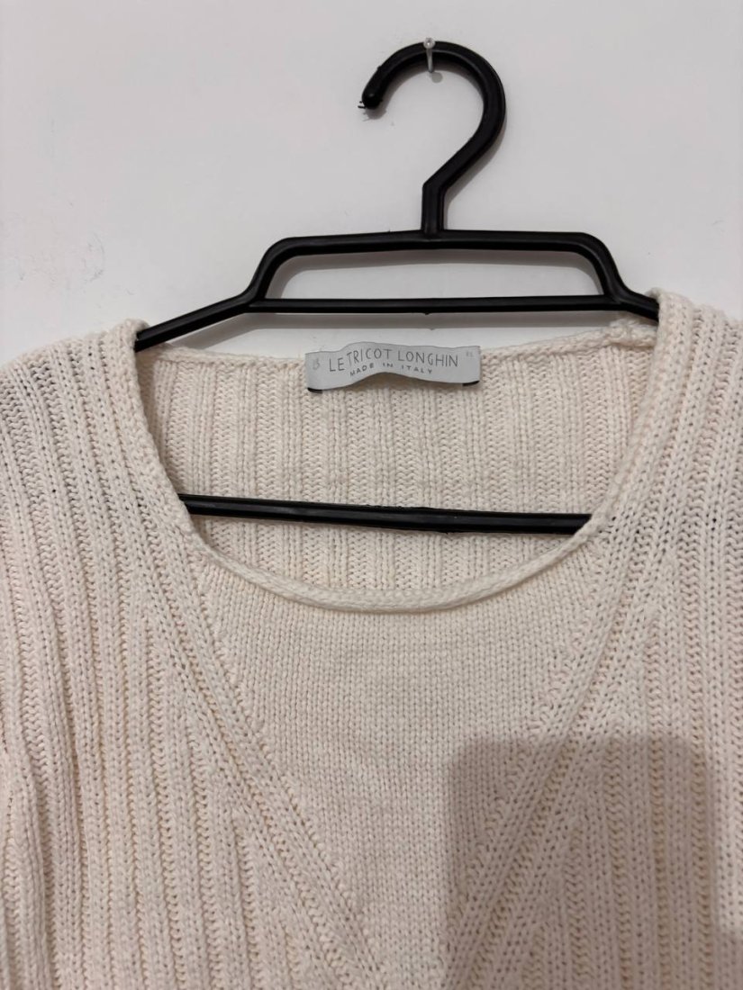Miękki i przyjemny w dotyku sweter premium Le Tricot Longhin – Made in Italy. Model w kolorze ecru, wykonany z mieszanki 50% bawełny i 50% akrylu, świetnie oddycha, a jednocześnie trzyma ciepło. Ma elegancki prążkowany splot oraz klasyczny dekolt V, który wysmukla sylwetkę.