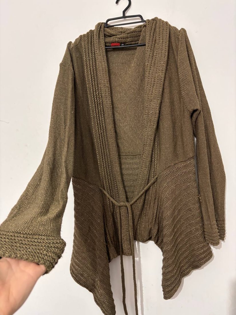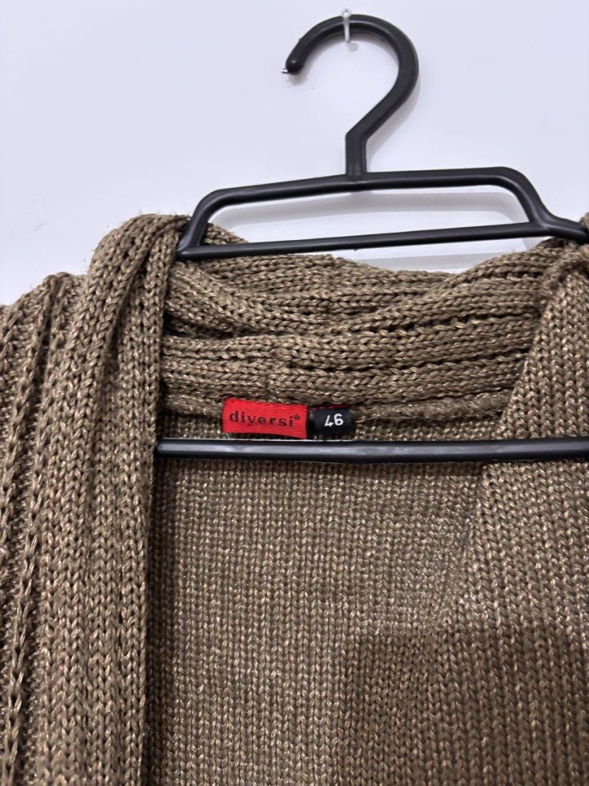 Stylowy kardigan marki Diversi w odcieniu ciepłego brązu. Model ma efektowny, dłuższy krój z ażurowym dołem i dekoracyjnym wiązaniem w talii, dzięki czemu pięknie układa się na sylwetce. Materiał miękki, przewiewny i przyjemny w noszeniu (70% akryl, 30% poliamid). Idealny na wiosnę, jesień lub do biura. Stan bardzo dobry, bez wad.