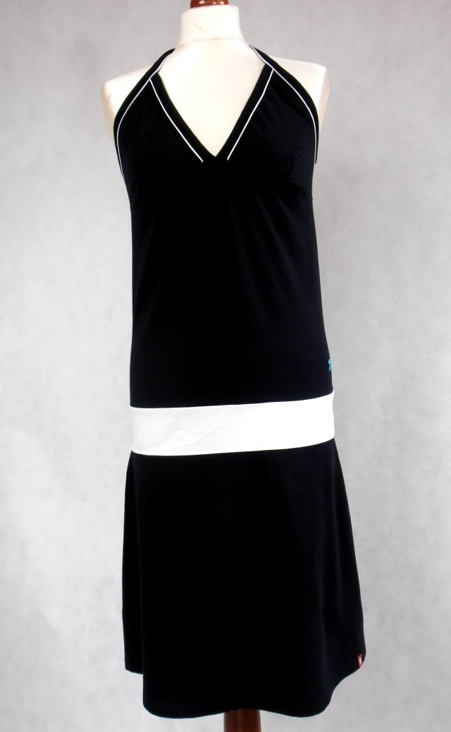 Letnia sukienka firmy edc by esprit.Rozmiar 44 na metce,wygląda na mniejszą.Materiał 90% bawełna+10%elstan.Odcięta pod biustem,Staniczek z paskami do wiązania na szyi z białą lamówką.Niżej wszyty biały pas +wyhaftowane logo.W dole na brzegu wszyta czerwona metka z napisem edc by esprit.Stan bardzo dobry.Długość mierzona od pachy 84 cm.pod pachami 90 cm.na płasko.