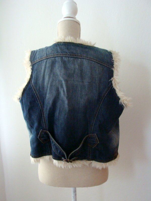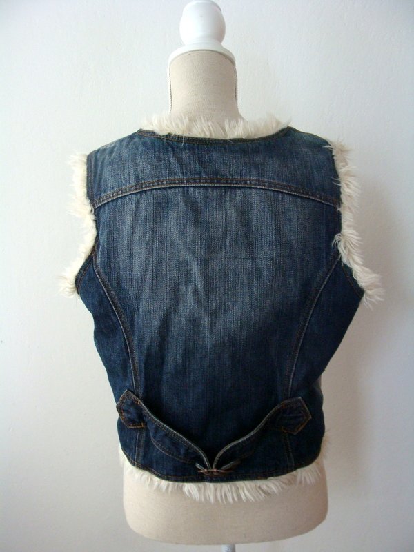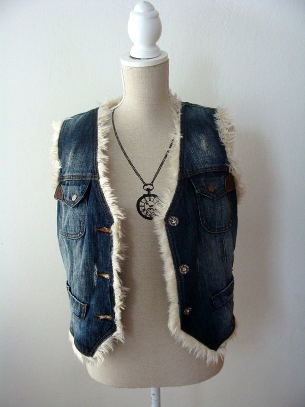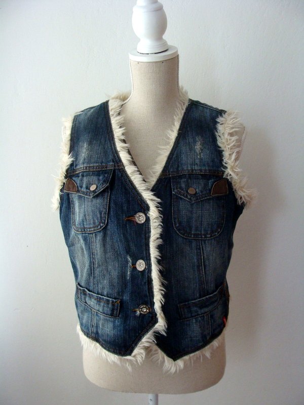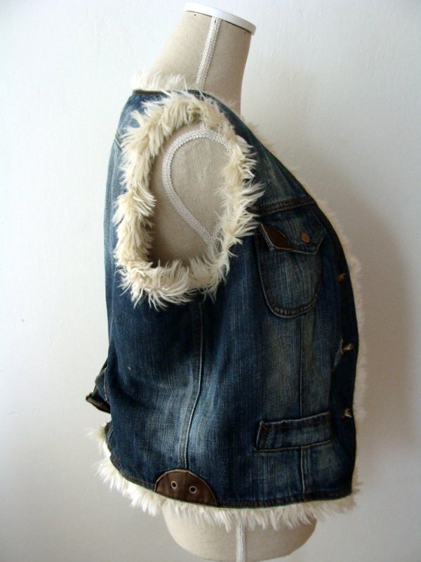 Ciepła kamizelka z ciemnego przecieranego jeansu, miejscowo z celowymi przetarciami, od wewnątrz z futerkiem z dłuższym włosem w kolorze złamanej bieli. Lekko taliowana z paskiem z tyłu z regulacją obwodu, Liczne elementy zdobnicze; stebnowania kontrastowa nicią, skórzane wstawki na kieszeniach, na pasku i po bokach kamizelki, dwie naszywane kieszenie u góry z zapinanymi patkami i dwie imitacje kieszeni u dołu. Zapinana na trzy sygnowane guziki w srebrnym kolorze .