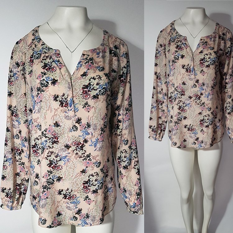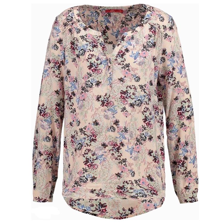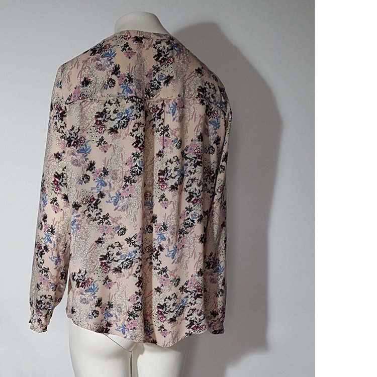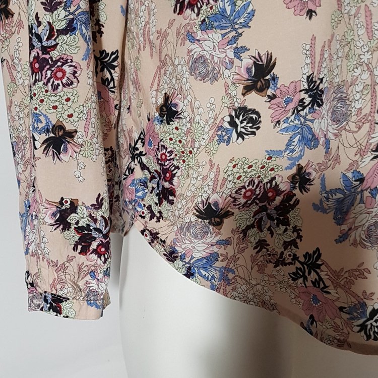 Bluzka koszulowa w motywy kwiatowe. Kolor tła: zgaszony, pastelowy róż wpadający w beżowe tony. Dekolt okrągły z rozcięciem, tył dłuższy.