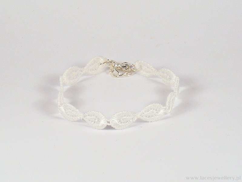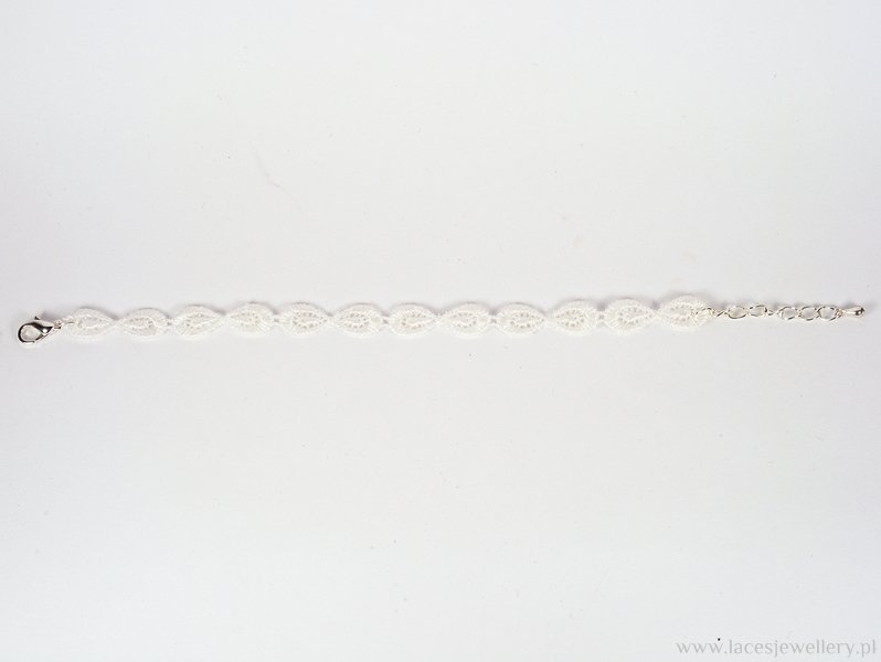 Kobieca bransoletka koronkowa, koloru białego. Ręcznie wykonana oraz usztywniona tak aby zachowała odpowiedni kształt i była odporna na zanieczyszczenia, wodę, pot itp. Zapinana na łańcuszek zakończony kuleczką. Łańcuszek posiada 8 ogniw dzięki czemu istenieje możliwość regulacji długośći bransoletki. Możliwość wykonania wzoru w innym rozmiarze.