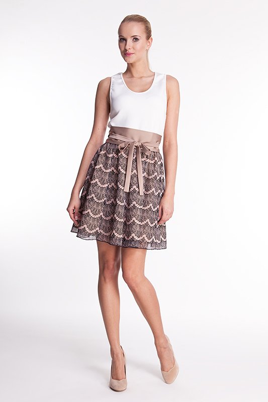 Dziewczęca, lekka spódnica oversize uszyta z klinów szyfonu z koronkowym nadrukiem, na podszewce.
