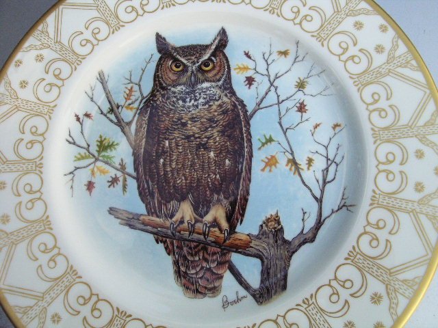 Bardzo Duży kolekcjonerski talerz porcelanowy z ciekawym zapleczem artystycznym - seria sów Ameryki Północnej z 1980 roku, limitowana do 15000 sztuk. Zdobienie sowie autorstwa E.M. Boehma, wybitnego rzeżbiarza i grafika, samouka, który w wyjątkowy sposób poświęcił się pasji porcelanowej, tworząc figurki ptasie niezwykłej precyzji i urody. Zachwycony możliwościami, jakie daje praca z porcelaną, tak pisał o tym materiale: Porcelana to tworzywo trwałe. Poddana odpowiednim procesom i właściwemu wypałowi, nie traci swych barw; może być bez ryzyka uszkodzeń poddawana ekstremalnym temperaturom. To tworzywo, które pozwala przedstawić wieczne piękno formy i koloru natury i przyrody. Założone wraz z żoną przedsiębiorstwo cieszy się do tej pory najwyższym uznaniem. Imieniem Boehma nazwano jedno ze skrzydeł Muzeów Watykańskich - wydarzenie bez precedensu, bowiem pozostałe 12 oddziałów Muzeów nosi imiona papieży i członków rodzin królewskich...