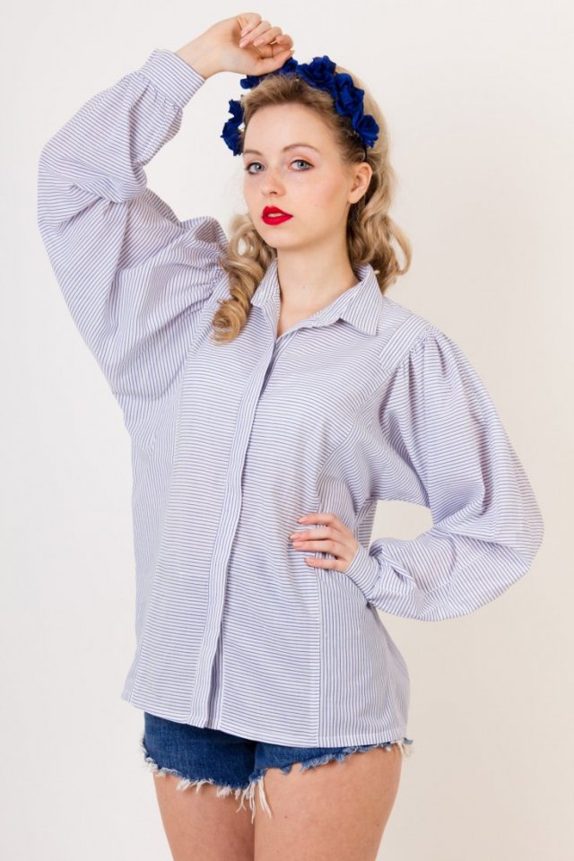 Koszula w niebiesko-białe paski w edwardiańskim stylu zapinana na ukryte guziki, szerokie rękawy zakończone mankietem.