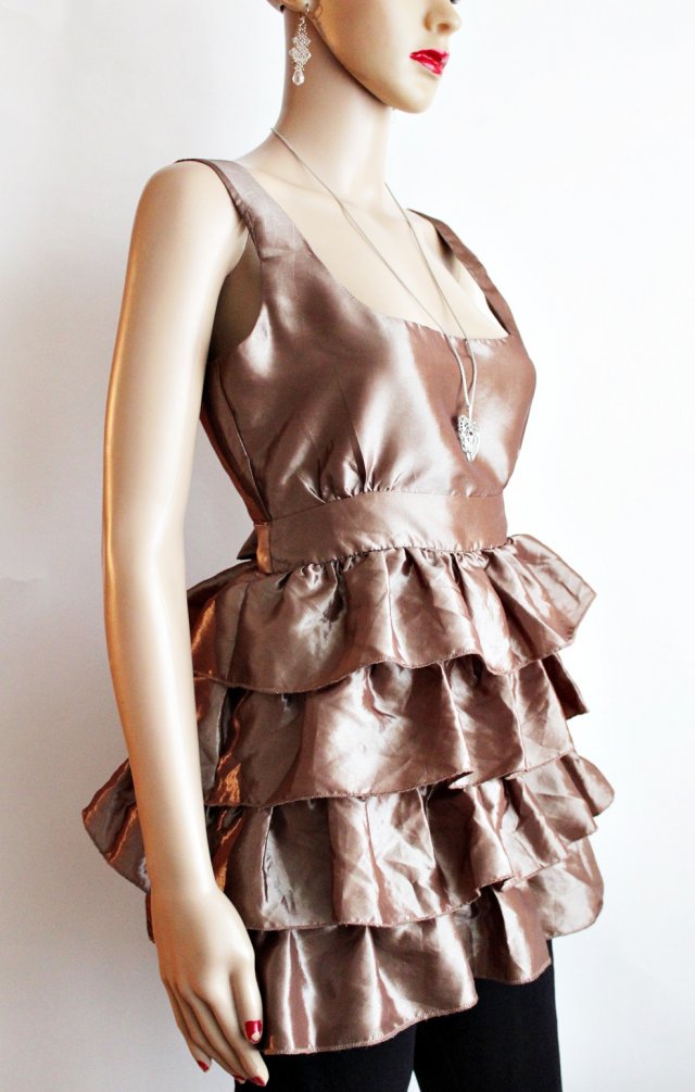 Niezwykle efektowna poprzez rzędy falban i metaliczny złoty kolor.