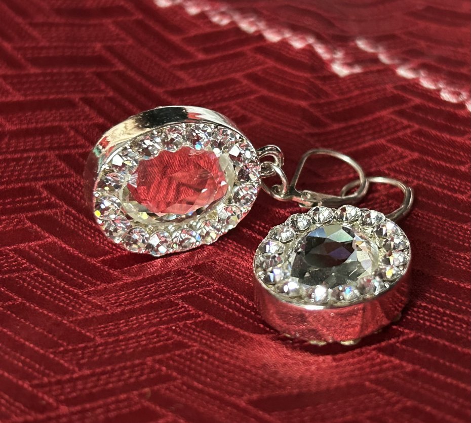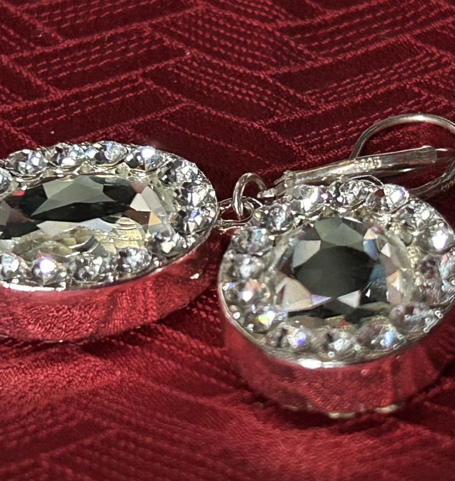 Duże, efektowne srebrne kolczyki z obustronnie osadzonymi w srebrnej obejmie cyrkoniami. Punca 925 . Dość ciężkie przez ilość cyrkonu i srebra , Długość całkowita 4 cm . Bez zapięcia i uchwytu 2 x nie całe 2 x około 7 mm . Stan zachowania bardzo dobry .