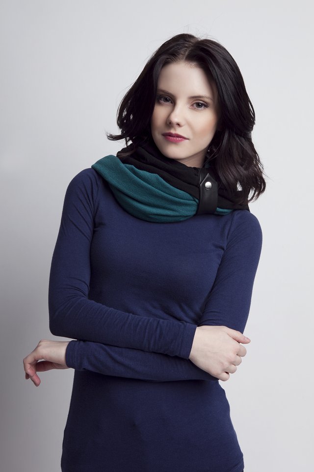 Obszerny, dwukolorowy szal-komin wykonany z miękkiej tkaniny. Otuli szyję w chłodne dni i pomoże stworzyć interesującą stylizację. Do komina dołączony jest pasek z napem – szybki sposób, by dodać stylizacji "pazura".