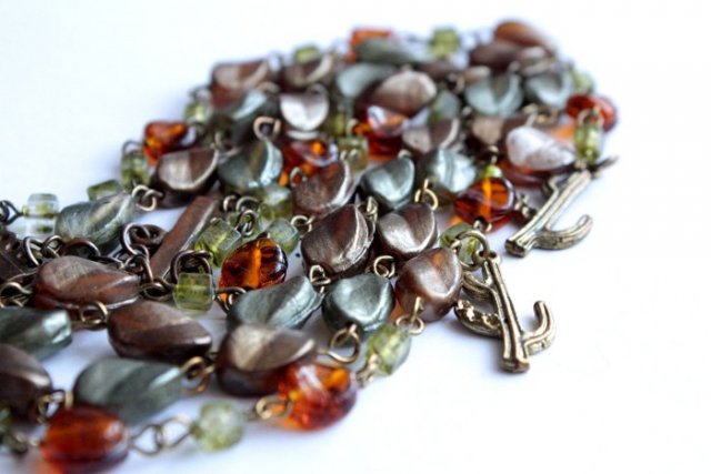 Efektowny naszyjnik składający się ze szklanych koralików na dwóch łańcuszkach, ozdobiony detalami w kolorze starego złota. Można nosić na kilka sposobów.