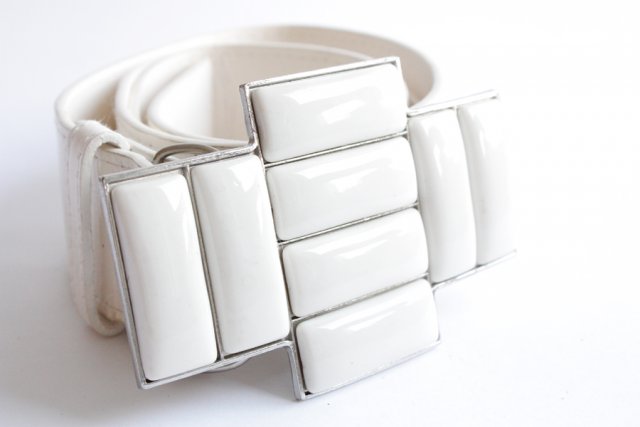 Pasek ze skóry ekologicznej z dużą, efektowną klamrą.