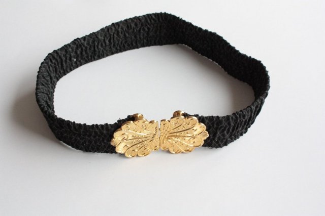 Piękny drapowany pasek w subtelny wzorek zapinany na efektowną klamrę. Bazą paska jest rypsowa tkanina pokrywająca gumę.