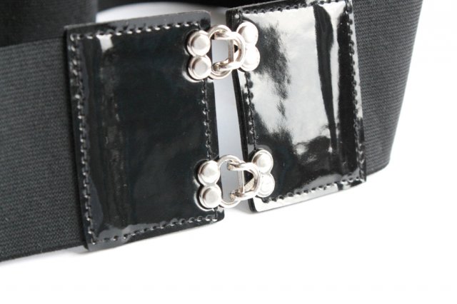 Elegancki, czarny pasek z dodatkiem lakierowanej ekoskóry. Bazą paska jest guma, która jest elastyczna, dopasowuje się do sylwetki i ładnie podkreśla talię.