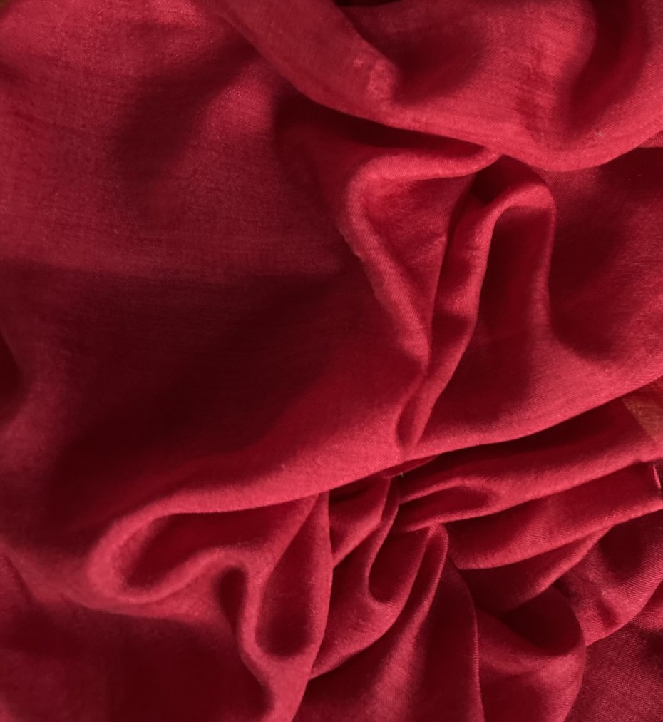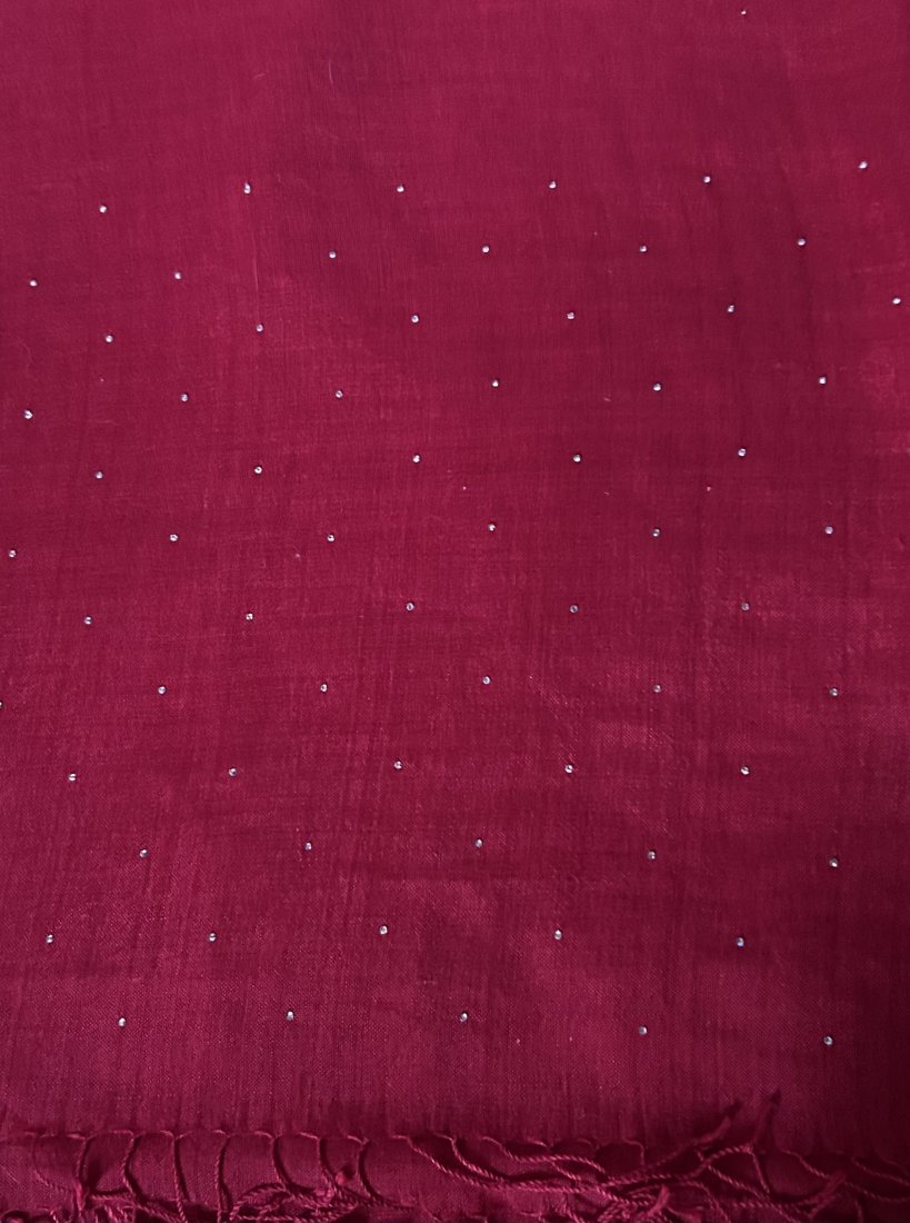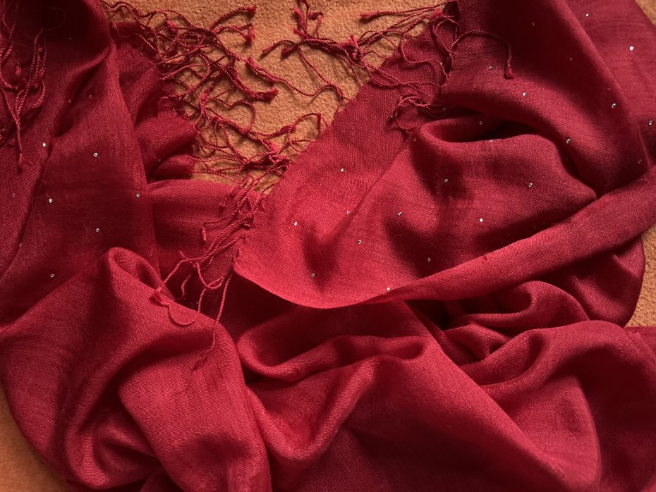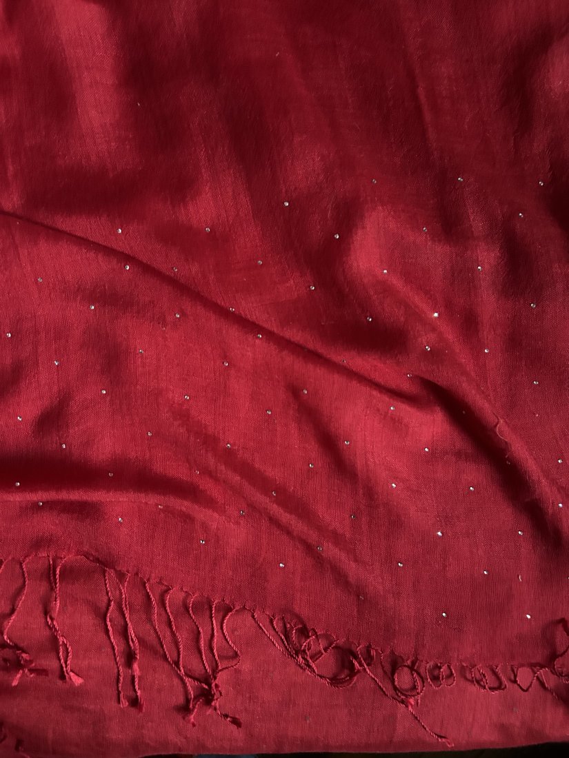Efektowny, smakowity, soczyście wiśniowy szał mgiełka 70 x prawie 190 plus frędzle z obu stron około 8 cm ozdobny pas z mikro dżetów 30 cm na końcach szala. Brak metki ze składem - nie umiem określić tkaniny. Stan zachowania bardzo dobry. Minimalne ślady użytkowania .