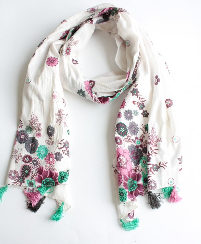 Miękki, duży szal ozdobiony na brzegach kwiatowymi motywami. Brzegi wykończono kolorowymi frędzlami. Materiał to prawdopodobnie bawełna lub wiskoza.