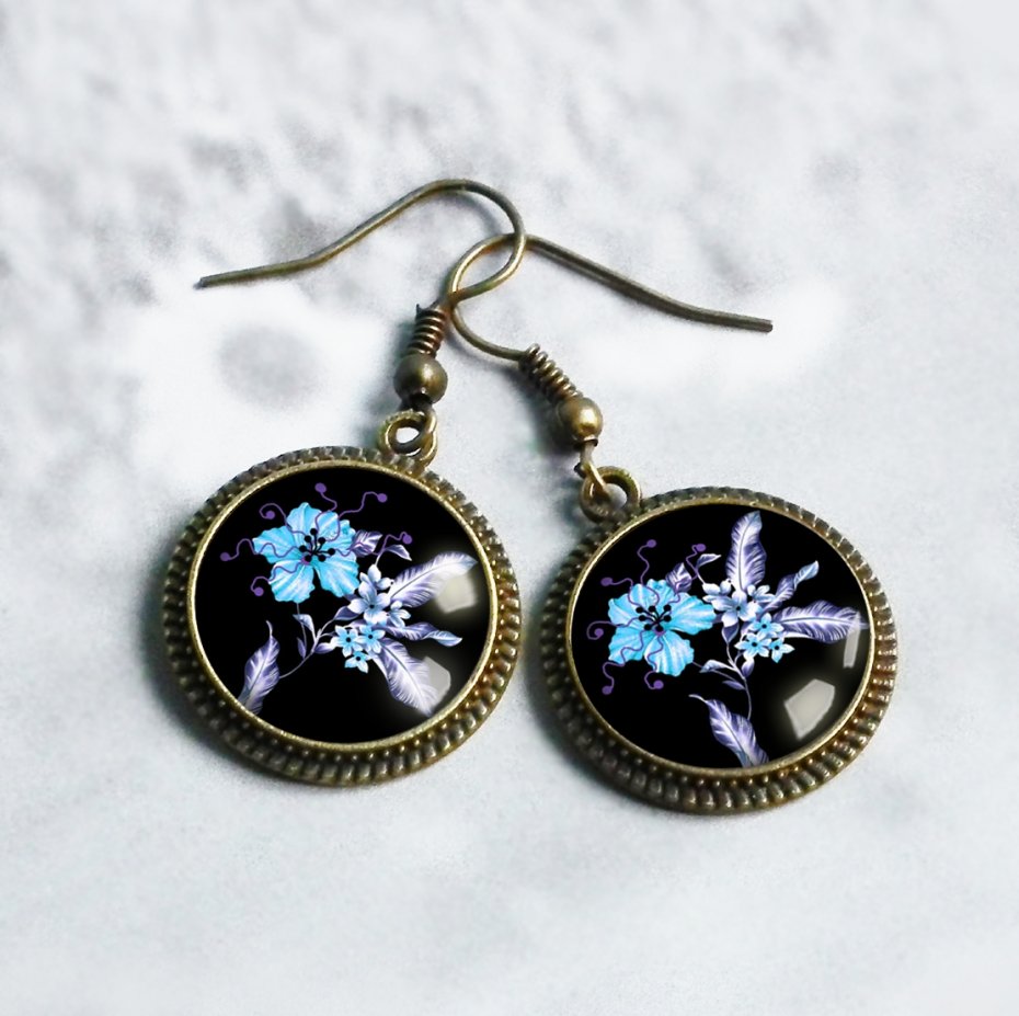 Kolczyki z grafiką artystyczną, zatopioną pod wypukłym szkiełkiem ( tzw. szklanym kaboszonem dającym efekt trójwymiarowości), w oprawie w kolorze antycznego złotego brązu. Grafika jest najwyższej jakości, wywołana na wysokiej klasy papierze fotograficznym. Bigle antyalergiczne w kolorze antycznego złotego brązu.