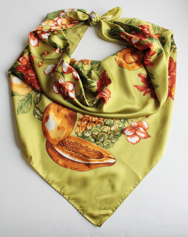 Włoska chusta w egzotyczne owoce i kwiaty marki Fiorucci.