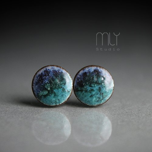 Ceramiczne okrągłe kolczyki w formie sztyftów, ręcznie wykonane z delikatnej gliny kamionkowej, jednostronnie szkliwione mieszanką błyszczących szaro zielonych szkliw z efektem plamek i drobinek, na sztyftach w kolorze srebrnym. Średnica ok. 11mm. Polecam