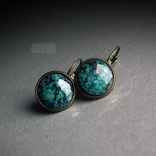 Okrągłe ceramiczne kolczyki, ręcznie wykonane z delikatnej jasnobeżowej gliny kamionkowej, szkliwione mieszanką zielonych szkliw z efektem plamek, na zamkniętych biglach w kolorze starego złota. Średnica elementu ceramicznego ok. 14mm, długość bigla ok 19mm. Polecam