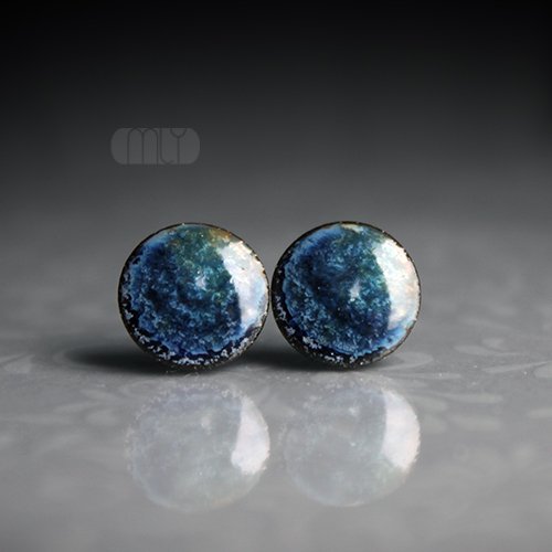Ceramiczne okrągłe kolczyki w formie sztyftów, ręcznie wykonane z delikatnej czekoladowobrązowej gliny kamionkowej, jednostronnie szkliwione mieszanką granatowo zielonych szkliw z efektem plamek, na antyalergicznych sztyftach w kolorze srebrnym. Średnica ok. 11mm. Polecam .
